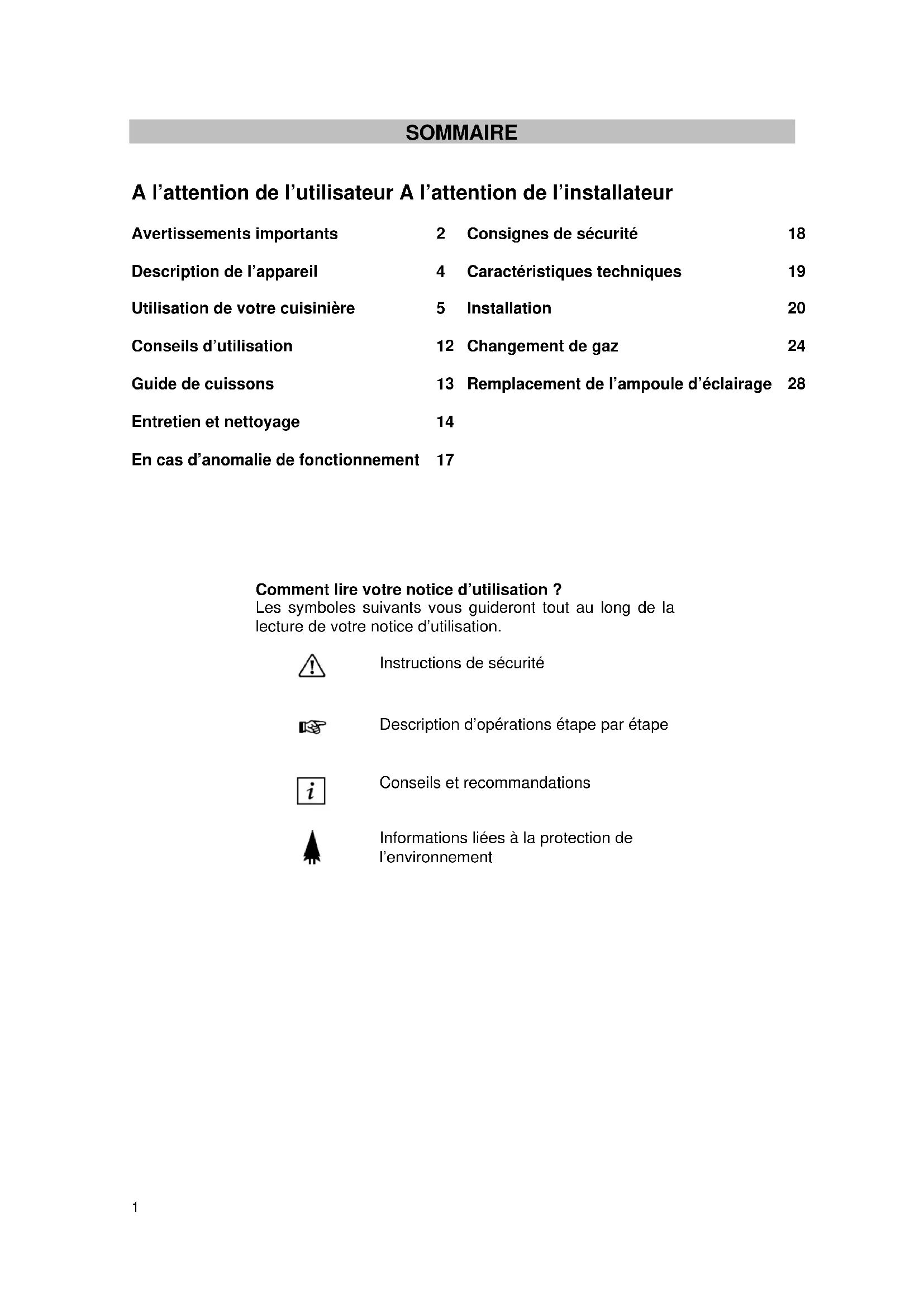 ZCG 3211 TW1 SOMMAIRE A l’attention de l’utilisateur A l’attention de l’installateur Avertissements importants Description de l’appareil Utilisation de votre cuisinière Conseils d’utilisation Guide de cuissons Entretien et nettoyage En cas d’anomalie de fonctionnement