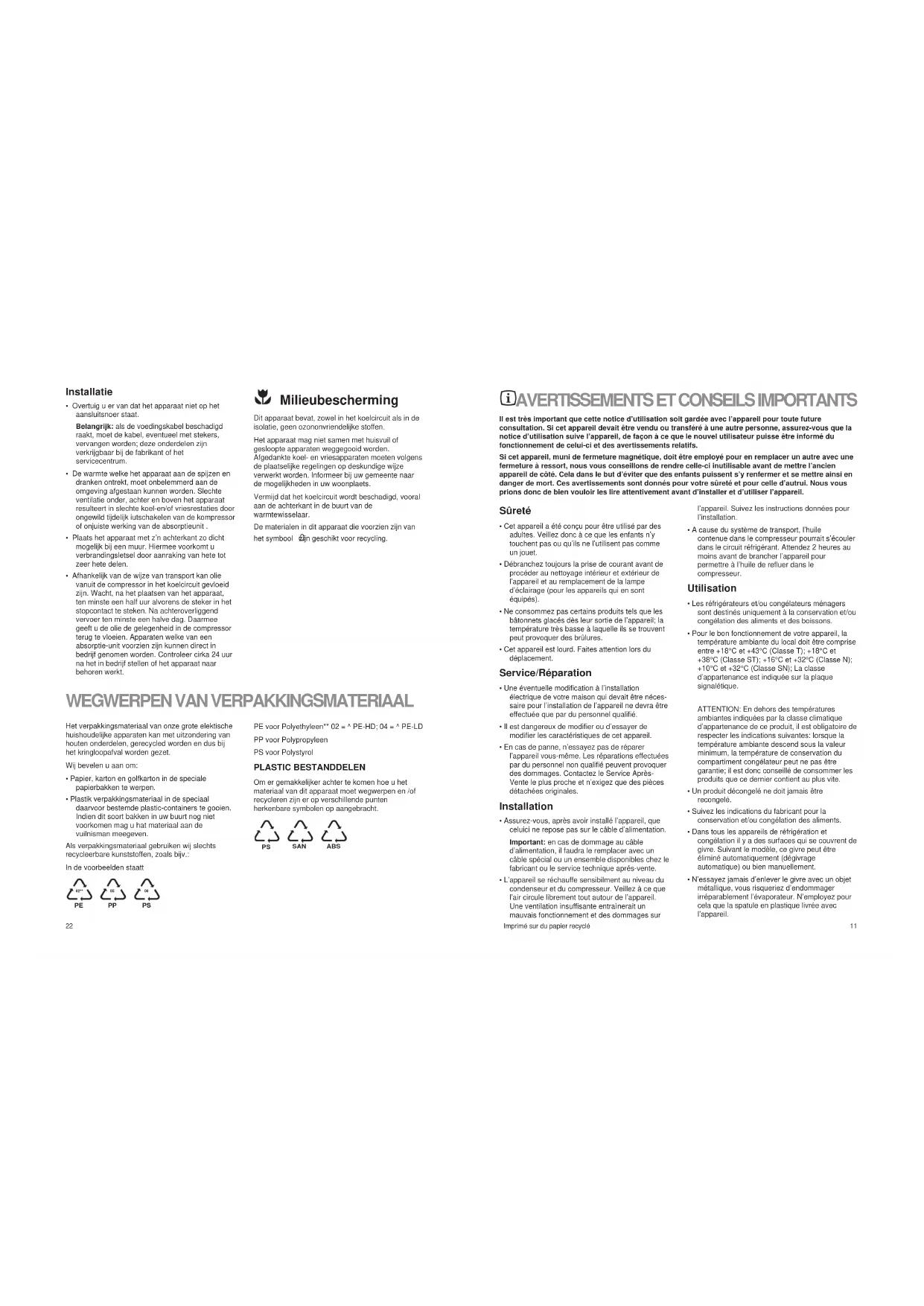 Pour faciliter l’élimination et :ou le recyclage des matériaux, la plupart des pièces de l’appareil ont une contremarque qui en facilite l’indentification.