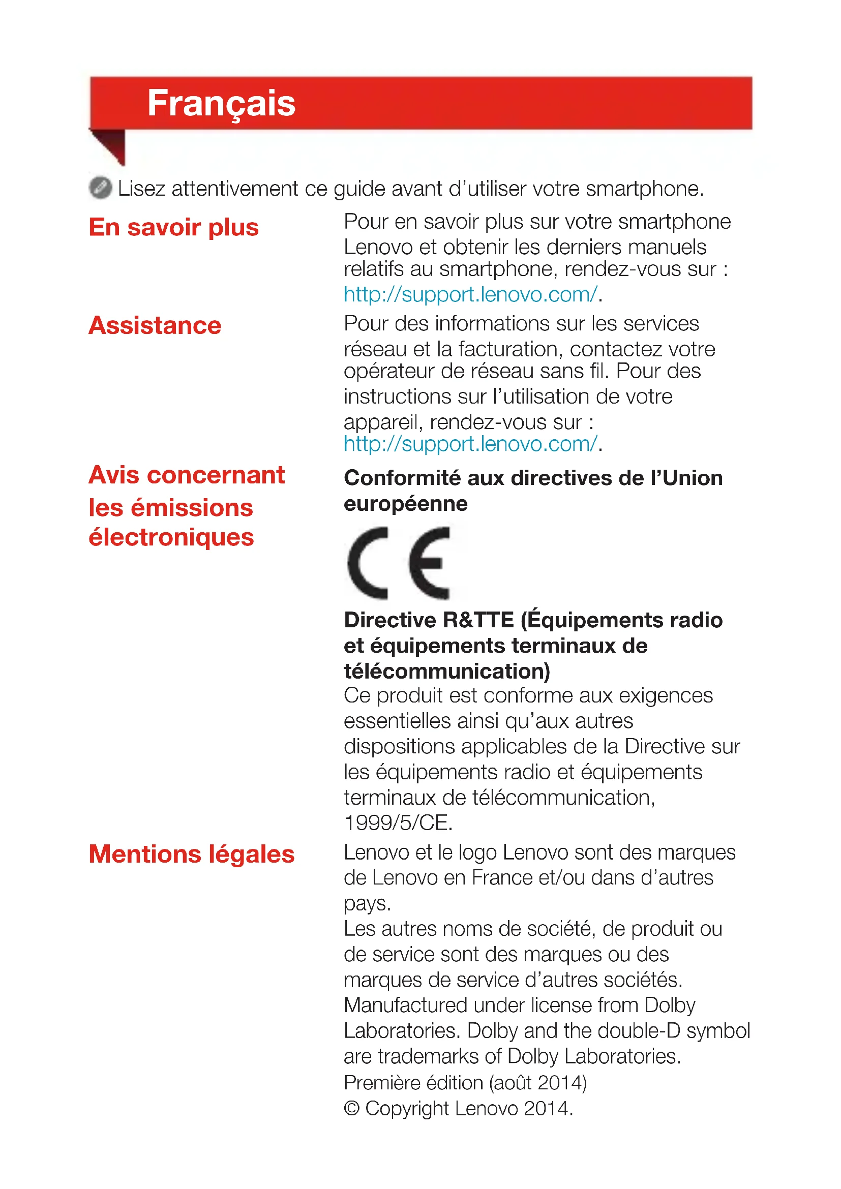 Charging the batteryFrançais En savoir plus Assistance Lisez attentivement ce guide avant d’utiliser votre smartphone. Pour en savoir plus sur votre smartphone Lenovo et obtenir les derniers manuels relatifs au smartphone, rendez-vous sur : http://support.lenovo.com/. Pour des informations sur les services réseau et la facturation, contactez votre opérateur de réseau sans fil. Pour des instructions sur l’utilisation de votre appareil, rendez-vous sur : http://support.lenovo.com/. Mentions légales Lenovo et le logo Lenovo sont des marques de Lenovo en France et/ou dans d’autres pays. Les autres noms de société, de produit ou de service sont des marques ou des marques de service d’autres sociétés. Manufactured under license from Dolby Laboratories. Dolby and the double-D symbol are trademarks of Dolby Laboratories. Conformité aux directives de l’Union européenne Avis concernant les émissions électroniques Directive R&TTE (Équipements radio et équipements terminaux de télécommunication) Ce produit est conforme aux exigences essentielles ainsi qu’aux autres dispositions applicables de la Directive sur les équipements radio et équipements terminaux de télécommunication, 1999/5/CE. Première édition (août 2014) © Copyright Lenovo 2014.Type: CMOS Pixels: 5,0 mégapixels (arrière) + 2,0 mégapixels (avant) Processeur: MTK MT6572, double cœur, 1,3GHz Taille: 4,0pouces Écran: 2-touches Résolution: 800 × 480 pixels Type LCD: TN Modèle: LenovoA319 Système: Android Bluetooth 4.0; WLAN 802.11 b/g/n; WCDMA, GSM; GPS Batterie: 1500mAh Hauteur: 123,5mm (4,862 pouces) Largeur: 63,8mm (2,512 pouces) Profondeur: 10,2mm (0,406 pouce) Poids: 129 g (0,284 lb) Modèle et système En fonction de la méthode de mesure utilisée, les dimensions et le poids peuvent varier légèrement. Affichage Batterie Processeur Dimensions et poids Appareil photo Communication sans fil Spécifications techniquesPrésentation Haut-parleur Connecteur casque Bouton marche/arrêt Connecteur micro USB Boutons de volume Caméra avant