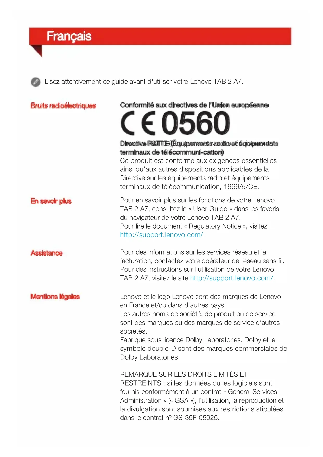 Batterie-Recycling-Kennzeichnungen Batterie-Recycling-Informationen für Taiwan Batterie-Recycling-Informationen für die USA und KanadaBatterie-Recycling-Informationen für die Europäische Union Energieeffizienz-Einstufung EurAsia-Regelkonformitäts-Einstufung Richtlinie zu Einschränkungen bei Gefahrstoffen (RoHS) Türkei The Lenovo product meets the requirements of the Republic of Turkey Directive on the Restriction of the Use of Certain Hazardous Substances in Electrical and Electronic Equipment (EEE). Ukraine Indien RoHS compliant as per E-Waste (Management & Handling) Rules, 2011. Europäische Union Lenovo products sold in the European Union, on or after 3 January 2013 meet the requirements of Directive 2011/65/EU on the restriction of the use of certain hazardous substances in electrical and electronic equipment (“RoHS recast” or “RoHS 2”). For more information about Lenovo progress on RoHS, go to: http://www.lenovo.com/social_responsibility/us/en/RoHS_Communication.pdf Hinweis für Benutzer in Mexiko La operación de este equipo está sujeta a las siguientes dos condiciones: (1) es posible que este equipo o dispositivo no cause interferencia perjudicial y (2) este equipo o dispositivo debe aceptar cualquier interferencia, incluyendo la que pueda causar su operación no deseada.Français Bruits radioélectriques En savoir plus Mentions légales Lenovo et le logo Lenovo sont des marques de Lenovo en France et/ou dans d’autres pays. Les autres noms de société, de produit ou de service sont des marques ou des marques de service d’autres sociétés. Fabriqué sous licence Dolby Laboratories. Dolby et le symbole double-D sont des marques commerciales de Dolby Laboratories. REMARQUE SUR LES DROITS LIMITÉS ET RESTREINTS: si les données ou les logiciels sont fournis conformément à un contrat «General Services Administration» («GSA»), l’utilisation, la reproduction et la divulgation sont soumises aux restrictions stipulées dans le contrat nºGS-35F-05925. Pour en savoir plus sur les fonctions de votre Lenovo TAB 2 A7, consultez le «User Guide» dans les favoris du navigateur de votre Lenovo TAB 2 A7. Pour lire le document «Regulatory Notice», visitez http://support.lenovo.com/. Assistance Pour des informations sur les services réseau et la facturation, contactez votre opérateur de réseau sans fil. Pour des instructions sur l’utilisation de votre Lenovo TAB 2 A7, visitez le site http://support.lenovo.com/. Lisez attentivement ce guide avant d'utiliser votre Lenovo TAB 2 A7. Directive R&TTE (Équipements radio et équipements terminaux de télécommuni-cation) Ce produit est conforme aux exigences essentielles ainsi qu’aux autres dispositions applicables de la Directive sur les équipements radio et équipements terminaux de télécommunication, 1999/5/CE. Conformité aux directives de l’Union européenne 0560Spécifications techniques MT8127 3450mAh Modèle et version Appareil photo Batterie Affichage Communication sans fil 0,3 MP (avant) +