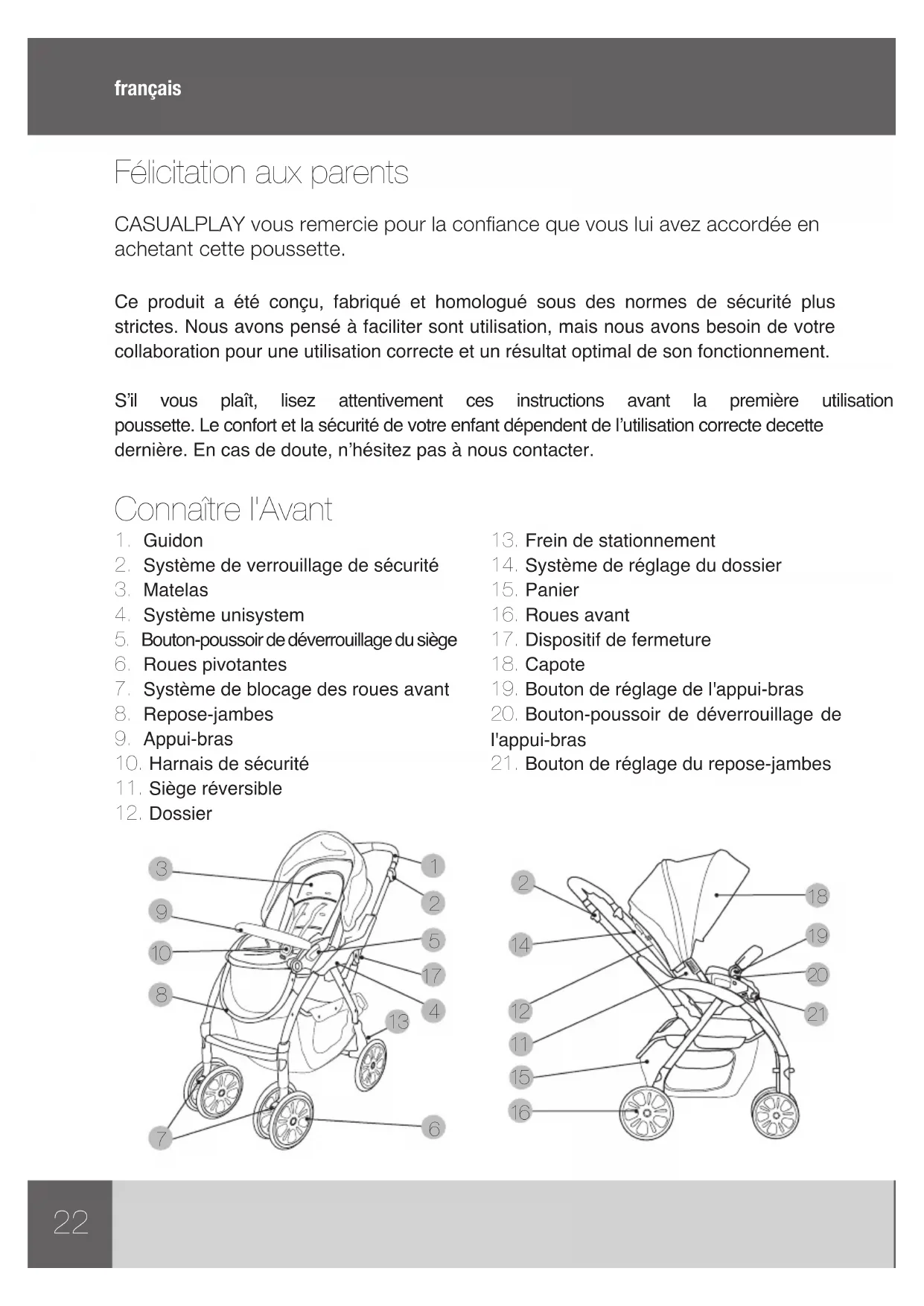 Félicitation aux parents CASUALPLAY vous remercie pour la conance que vous lui avez accordée en achetant cette poussette. Ce produit a été conçu, fabriqué et homologué sous des normes de sécurité plus strictes. Nous avons pensé à faciliter sont utilisation, mais nous avons besoin de votre collaboration pour une utilisation correcte et un résultat optimal de son fonctionnement. S’il vous plaît, lisez attentivement ces instructions avant la première utilisation de cette poussette.Leconfortetlasécuritédevotreenfantdépendentdel’utilisationcorrectedecette dernière.Encasdedoute,n’hésitezpasànouscontacter. Connaître l'Avant