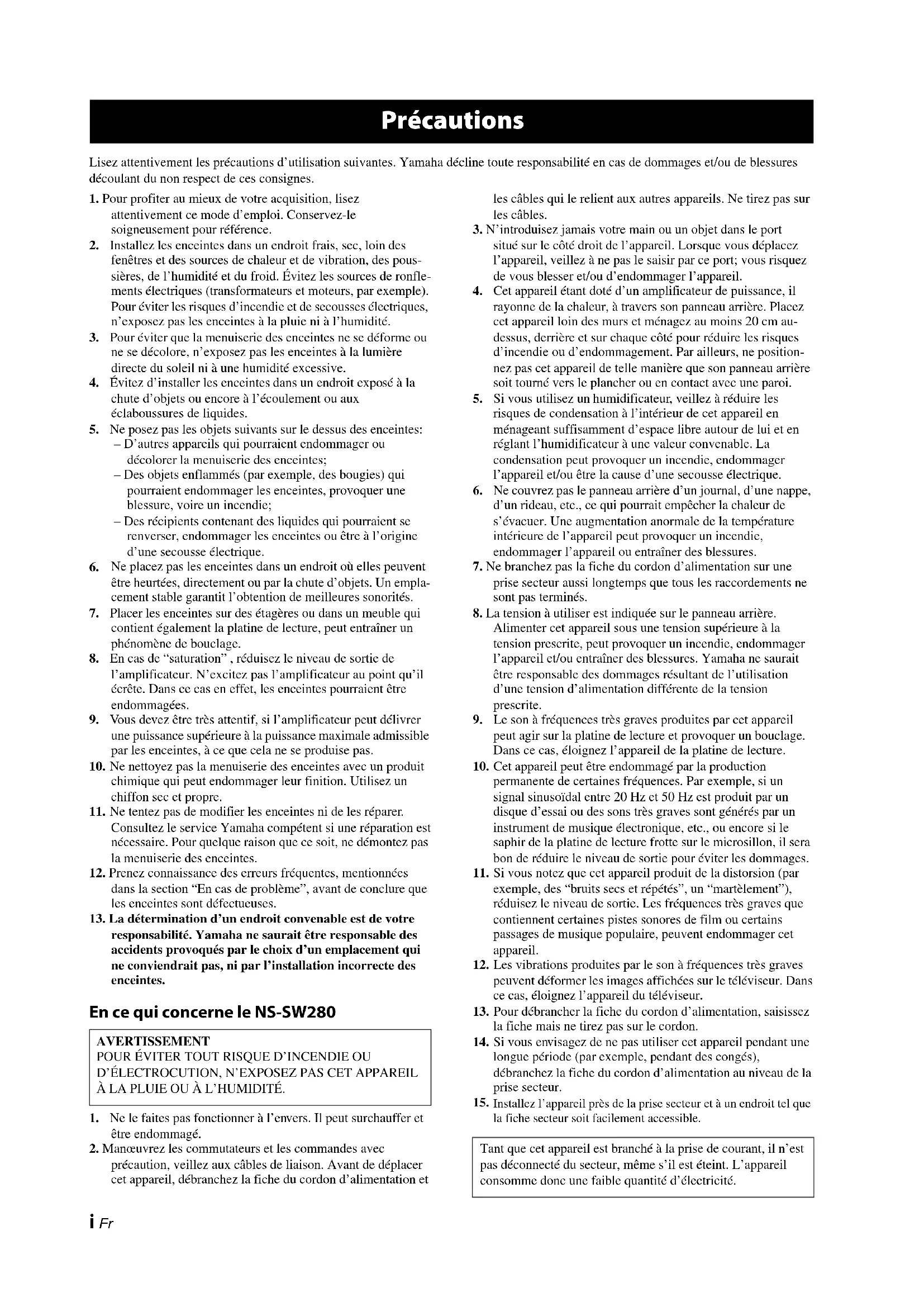 responsabilité. Yamaha ne saurait être responsable des accidents provoqués par le choix d’un emplacement qui ne conviendrait pas, ni par l’installation incorrecte des enceintes. En ce qui concerne le NS-SW280