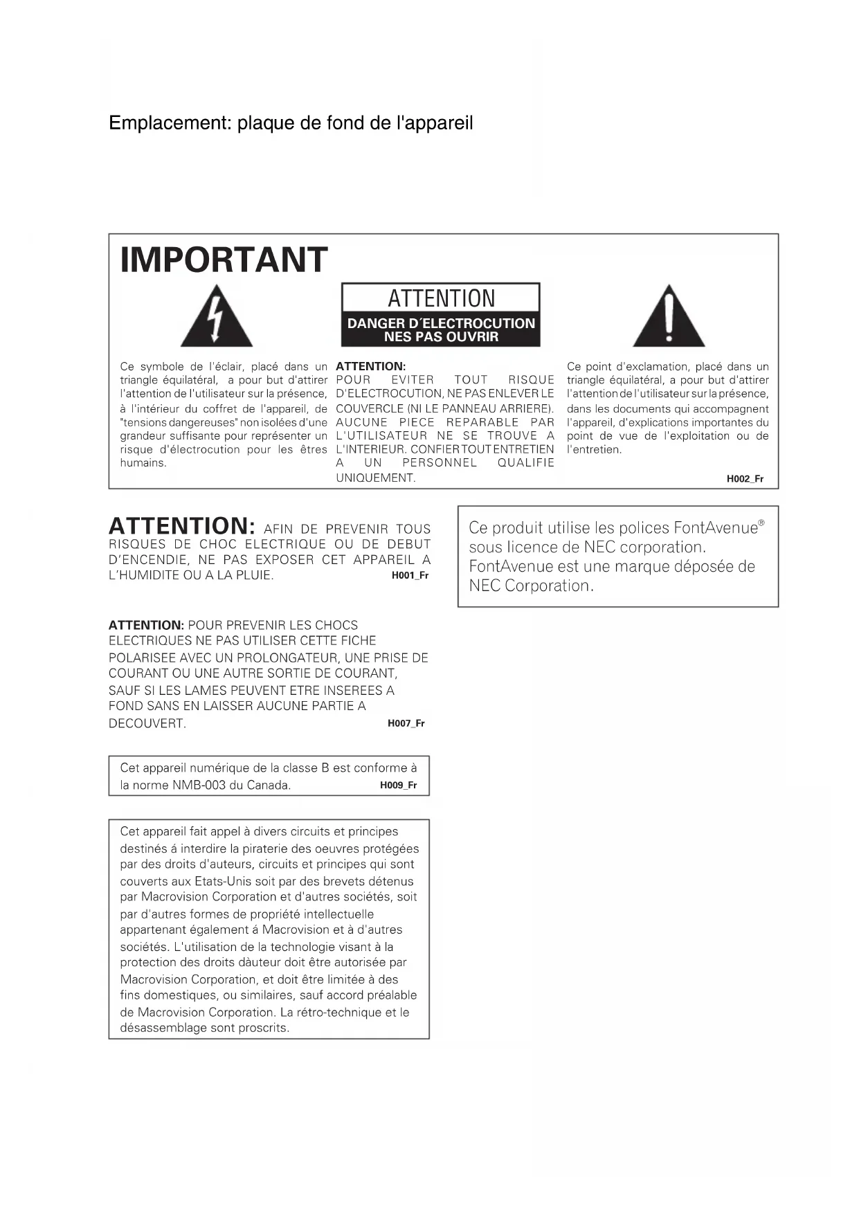 ATTENTION ATTENTION: AFIN DE PREVENIR TOUSRISQUES DE CHOC ELECTRIQUE OU DE DEBUTD’ENCENDIE, NE PAS EXPOSER CET APPAREIL AL’HUMIDITE OU A LA PLUIE.H001_FrATTENTION: POUR PREVENIR LES CHOCSELECTRIQUES NE PAS UTILISER CETTE FICHEPOLARISEE AVEC UN PROLONGATEUR, UNE PRISE DECOURANT OU UNE AUTRE SORTIE DE COURANT,SAUF SI LES LAMES PEUVENT ETRE INSEREES AFOND SANS EN LAISSER AUCUNE PARTIE ADECOUVERT.H007_FrCet appareil numérique de la classe B est conforme àla norme NMB-003 du Canada.H009_FrCet appareil fait appel à divers circuits et principesdestinés á interdire la piraterie des oeuvres protégéespar des droits d'auteurs, circuits et principes qui sontcouverts aux Etats-Unis soit par des brevets détenuspar Macrovision Corporation et d'autres sociétés, soitpar d'autres formes de propriété intellectuelleappartenant également á Macrovision et à d'autressociétés. L'utilisation de la technologie visant à laprotection des droits dàuteur doit être autorisée parMacrovision Corporation, et doit être limitée à desfins domestiques, ou similaires, sauf accord préalablede Macrovision Corporation. La rétro-technique et ledésassemblage sont proscrits. Ce produit utilise les polices FontAvenue