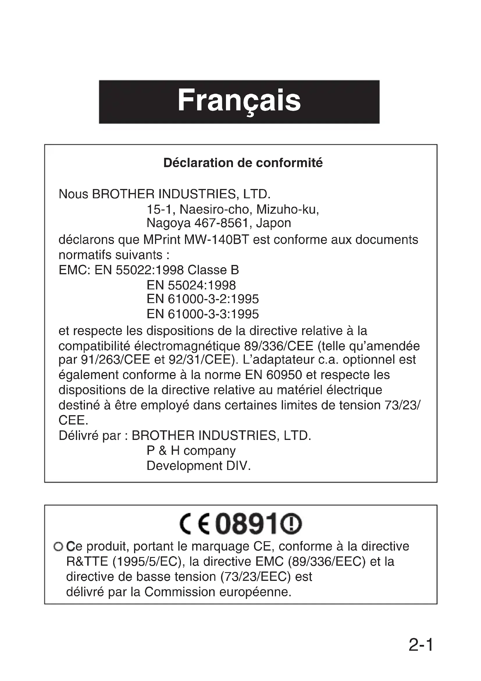 - Les appareils utilisant la technologie Bluetooth peuvent demander quelques secondes pour que la fonction Bluetooth soit opérationnelle après sa mise en fonction. Cette durée varie en fonction de l'appareil. (Le présent appareil demande un maximum de 8 secondes.)MW-140BT Quick Guide (french) MW-140BT Quick Guide (french) 2-2 Français Déclaration de conformité Nous BROTHER INDUSTRIES, LTD. 15-1, Naesiro-cho, Mizuho-ku, Nagoya 467-8561, Japon déclarons que MPrint MW-140BT est conforme aux documents normatifs suivants : EMC: EN 55022:1998 Classe B EN 55024:1998 EN 61000-3-2:1995 EN 61000-3-3:1995 et respecte les dispositions de la directive relative à la compatibilité électromagnétique 89/336/CEE (telle qu’amendée par 91/263/CEE et 92/31/CEE). L’adaptateur c.a. optionnel est également conforme à la norme EN 60950 et respecte les dispositions de la directive relative au matériel électrique destiné à être employé dans certaines limites de tension 73/23/ CEE. Délivré par : BROTHER INDUSTRIES, LTD. P & H company Development DIV.