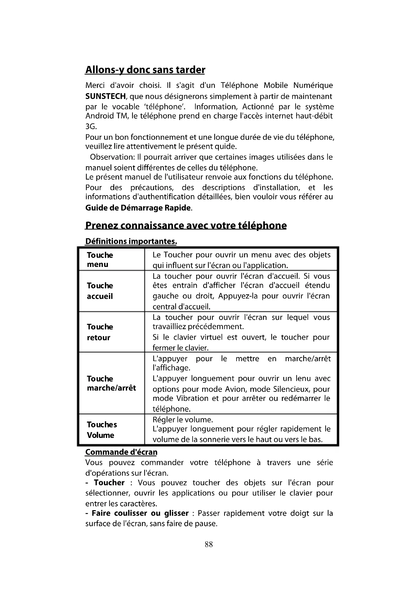 Merci d'avoir choses. Il s'agit d'un téléphone Mobile Numérique SUNSTECH, que nous désignerons simplement à partir de maintainant par le vocable 'telephone'. Information, Actionné par le système Android TM, le téléphone prend en charge l'accès internet haut-debit 3G.