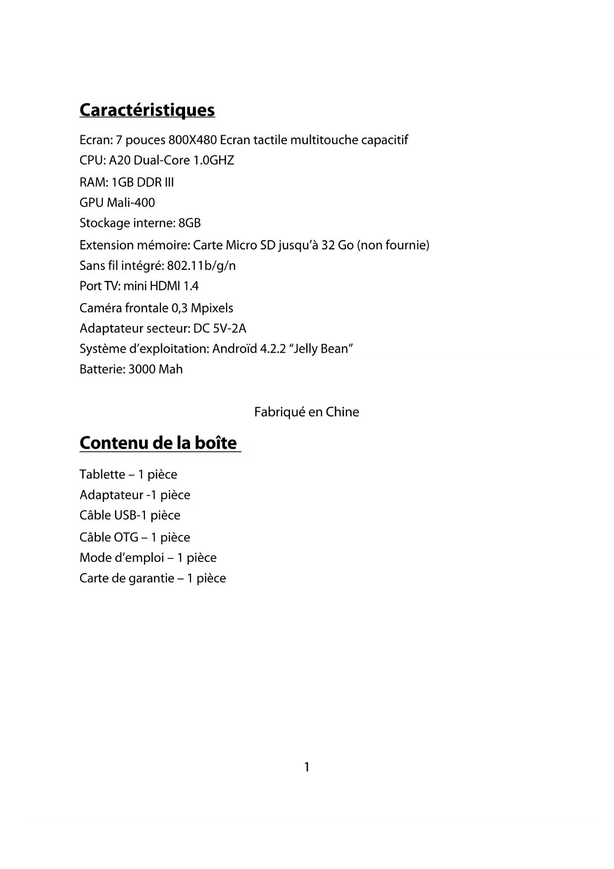 | Caractéristiques techniques | Écran tactile 7 pouces, résolution 1024 x 600 pixels, processeur Quad-Core, 1 Go de RAM, 8 Go de stockage interne, extensible via microSD. |