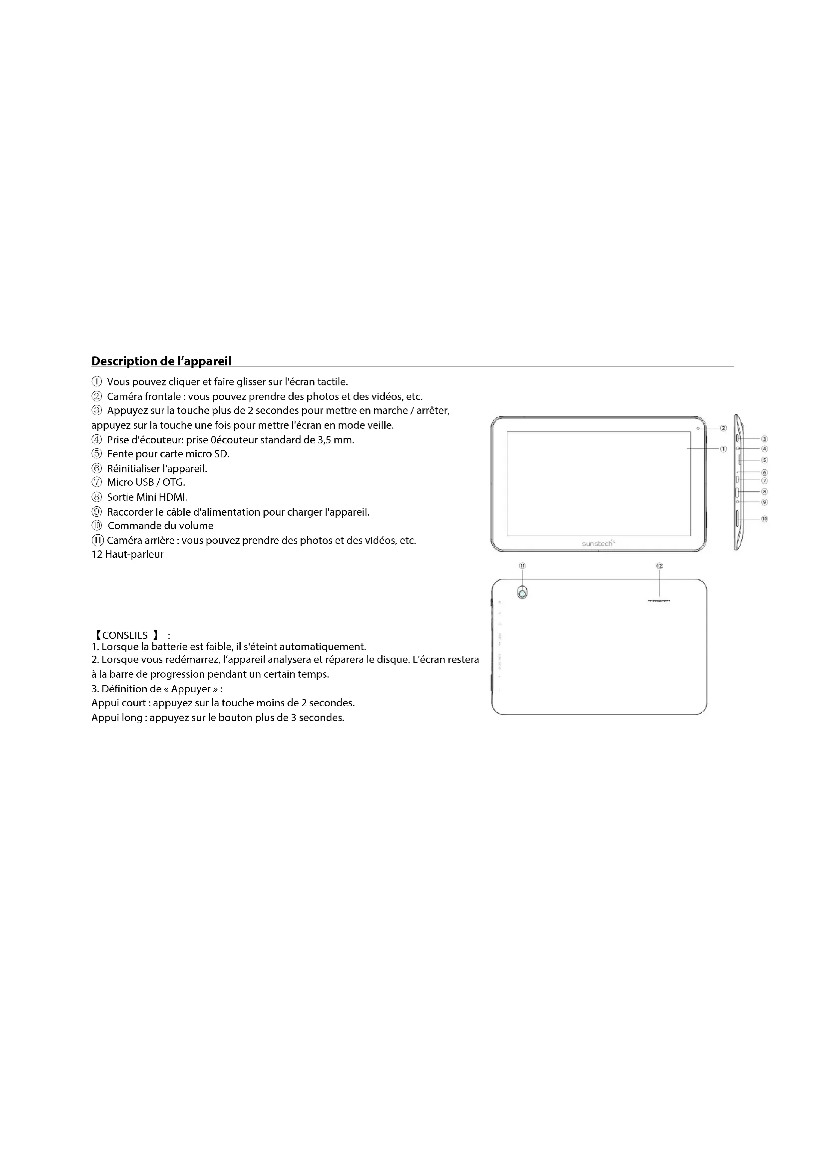 - En utilisant l'appareil, assurez-vous de faire des copies de sauvégarde des données importantes. SUNSTECH ne sera tenue responsable d'aucune perte de données.