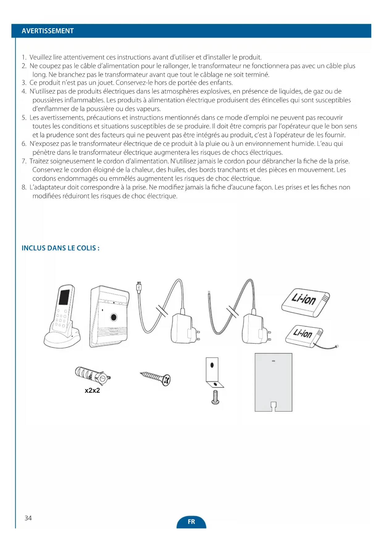 Seul un adulte doit remplacer et installer la batterie. Retirer les batteries épuisées de cet appareil. Ne pas jeter les batteries dans le feu car elles pourraient exploser ou présenter des fuites. Ne pas mettre en court-circuit les bornes des batteries. Ne pas mélanger des batteries épuisées avec des batteries neuves. Ne pas mélanger des batteries alcalines (carbone-zinc) avec des batteries rechargeables ou au lithium. Ne pas utiliser des batteries rechargeables avec cet appareil. Ne pas recharger des batteries non rechargeables. Ne pas mettre en contact direct cet appareil avec une source de chaleur ou une flamme. Ne pas permettre à de l’eau d’entrer en contact avec les batteries ou les fils. Installer avec soin pour éviter d’endommager les batteries. Lors de l’installation des batteries dans leurs logements, veuillez respecter la polarité (+)/(-). Utiliser uniquement les batteries recommandées. Retirer les batteries de l’appareil s’il est inutilisé pour une période prolongée. Tenir cet appareil hors de la portée des enfants en bas âge. Conserver les batteries inutilisées dans leur emballage d’origine En fin de vie, ce produit doit être retourné dans un centre de traitement des déchets afin d’extraire les batteries. FR4344 x2 x2 ADVERTENCIA