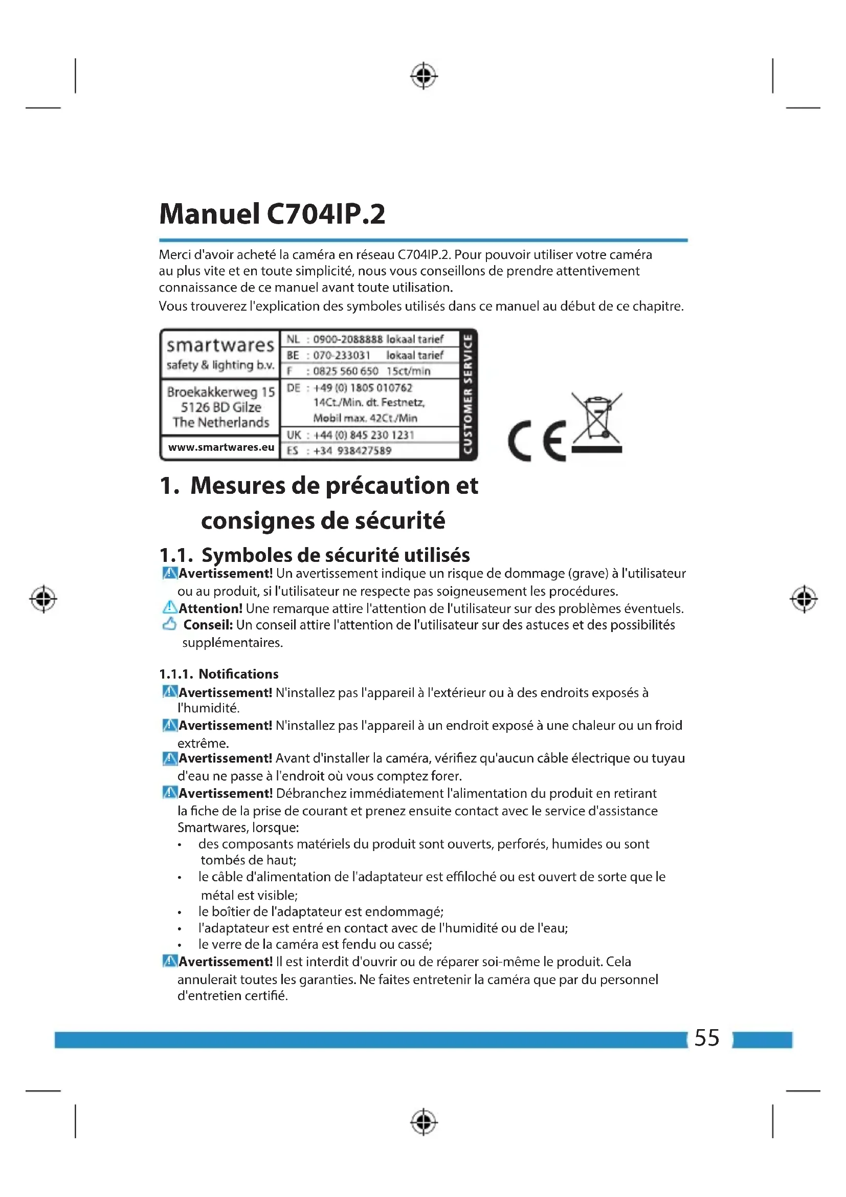 Voor dit apparaat geldt een beperkte 3 jarige garantie. Ga voor de garantievoorwaarden naar: www.smartwares.eu.55 Manuel C704IP.2 Merci d'avoir acheté la caméra en réseau C704IP.2. Pour pouvoir utiliser votre caméra au plus vite et en toute simplicité, nous vous conseillons de prendre attentivement connaissance de ce manuel avant toute utilisation. Vous trouverez l'explication des symboles utilisés dans ce manuel au début de ce chapitre. www.smartwares.eu