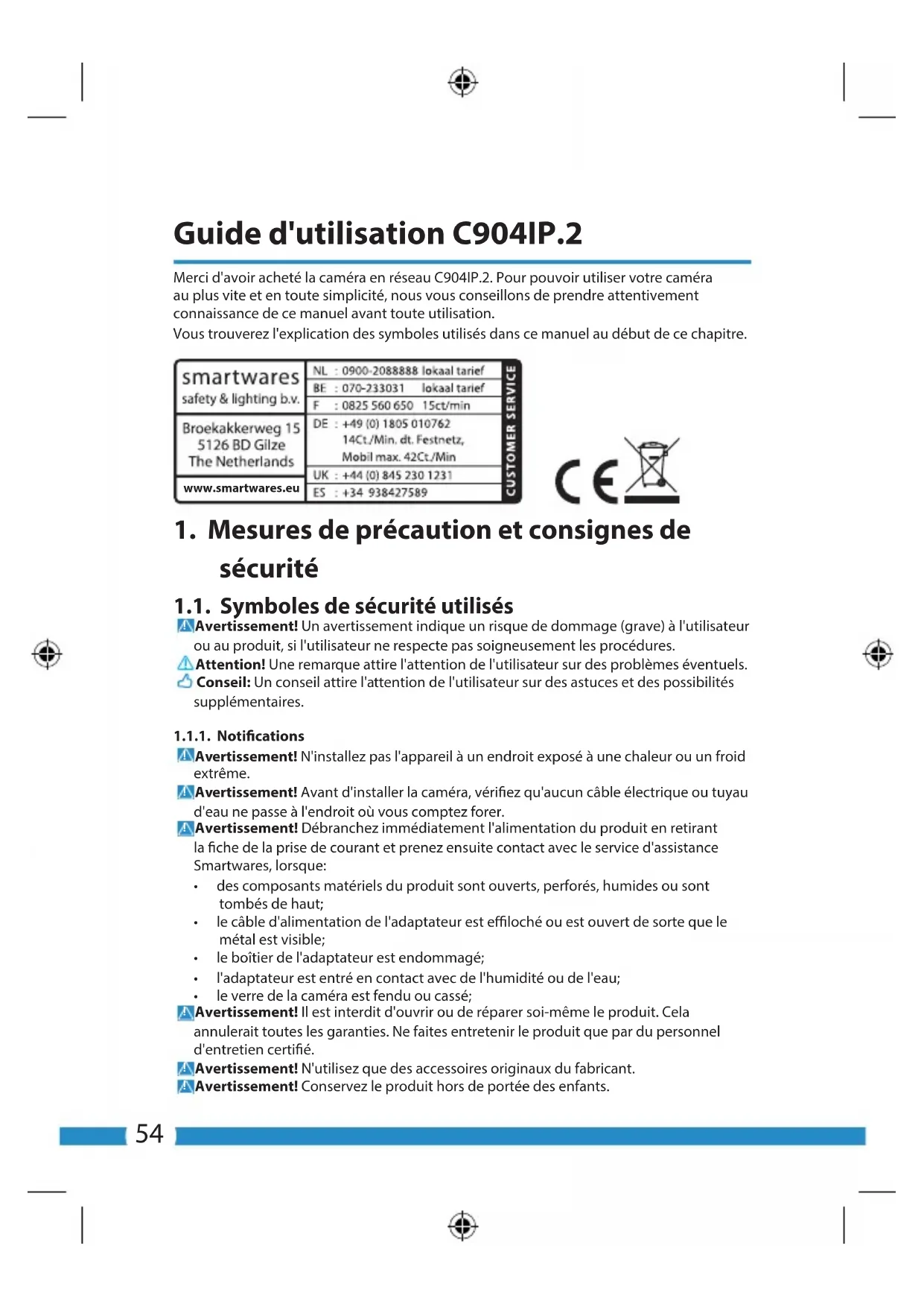 Voor dit apparaat geldt een beperkte 3 jarige garantie. Ga voor de garantievoorwaarden naar: www.smartwares.eu.54 Guide d'utilisation C904IP.2 Merci d'avoir acheté la caméra en réseau C904IP.2. Pour pouvoir utiliser votre caméra au plus vite et en toute simplicité, nous vous conseillons de prendre attentivement connaissance de ce manuel avant toute utilisation. Vous trouverez l'explication des symboles utilisés dans ce manuel au début de ce chapitre. www.smartwares.eu