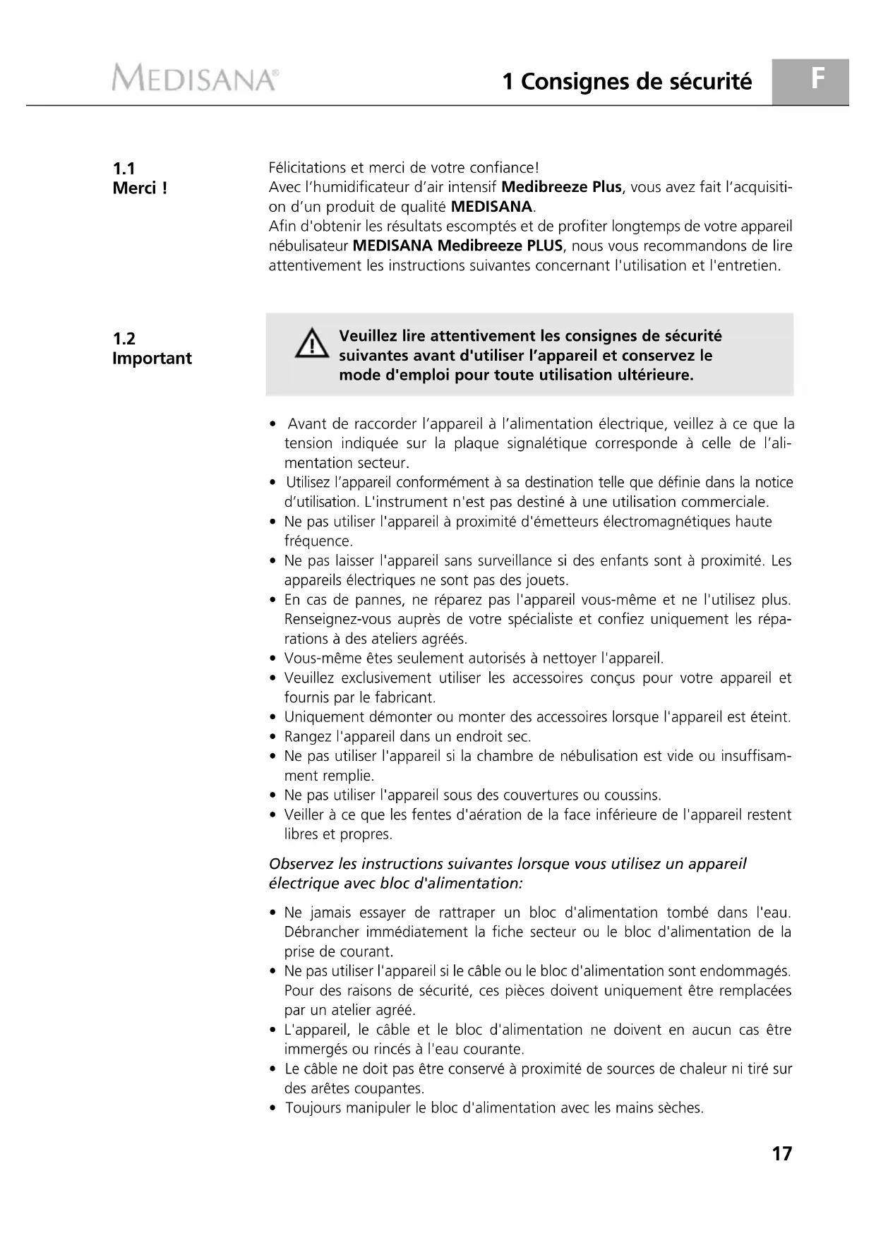 Important Félicitations et merci de votre confiance! Avec l’humidificateur d’air intensif Medibreeze Plus, vous avez fait l’acquisiti- on d’un produit de qualité MEDISANA. Afin d'obtenir les résultats escomptés et de profiter longtemps de votre appareil nébulisateur MEDISANA Medibreeze PLUS, nous vous recommandons de lire attentivement les instructions suivantes concernant l'utilisation et l'entretien. Veuillez lire attentivement les consignes de sécurité suivantes avant d'utiliser l’appareil et conservez le mode d'emploi pour toute utilisation ultérieure.