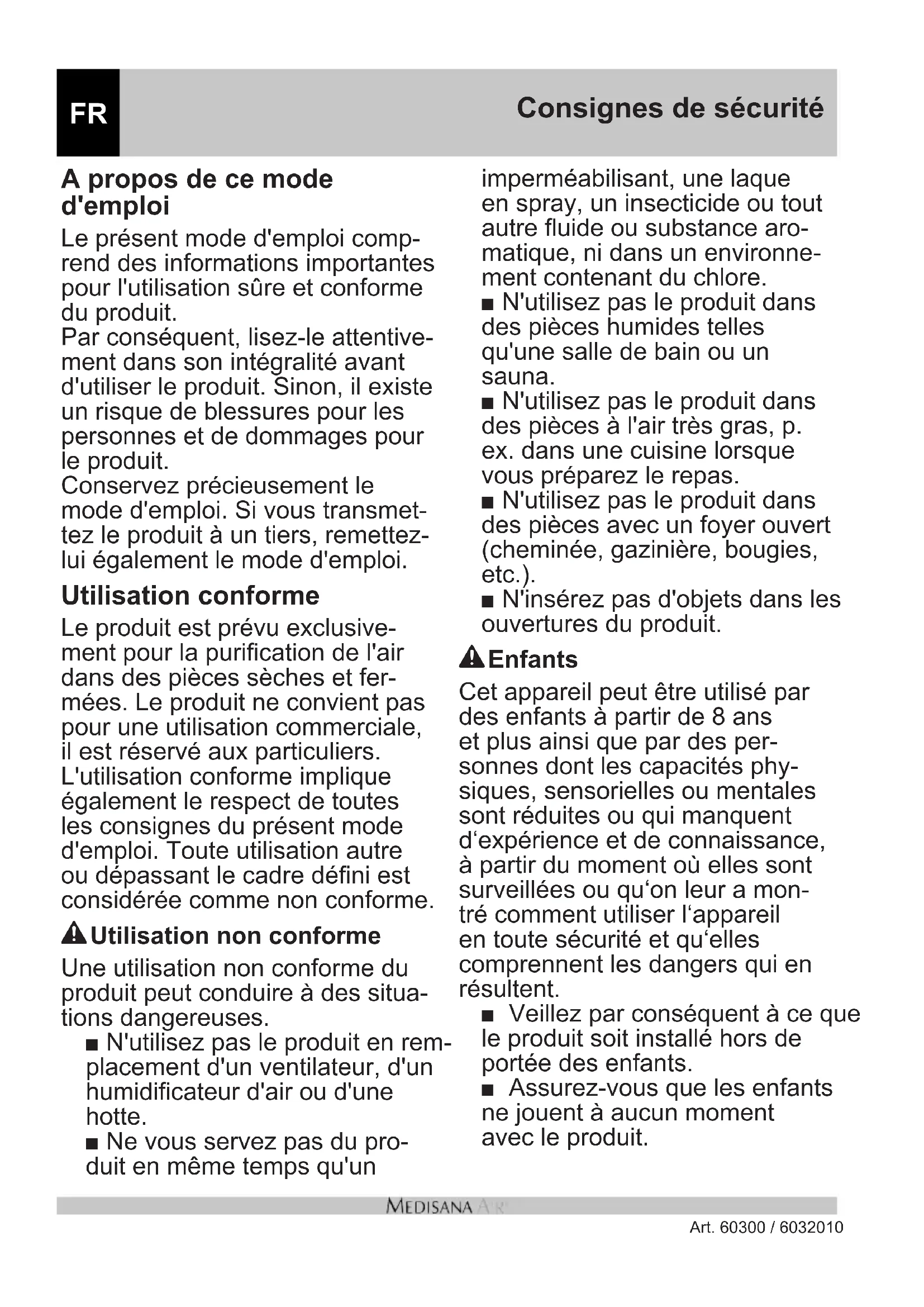 Retrouvez gratuitement la notice de l'appareil Air 60300 MEDISANA au format PDF.