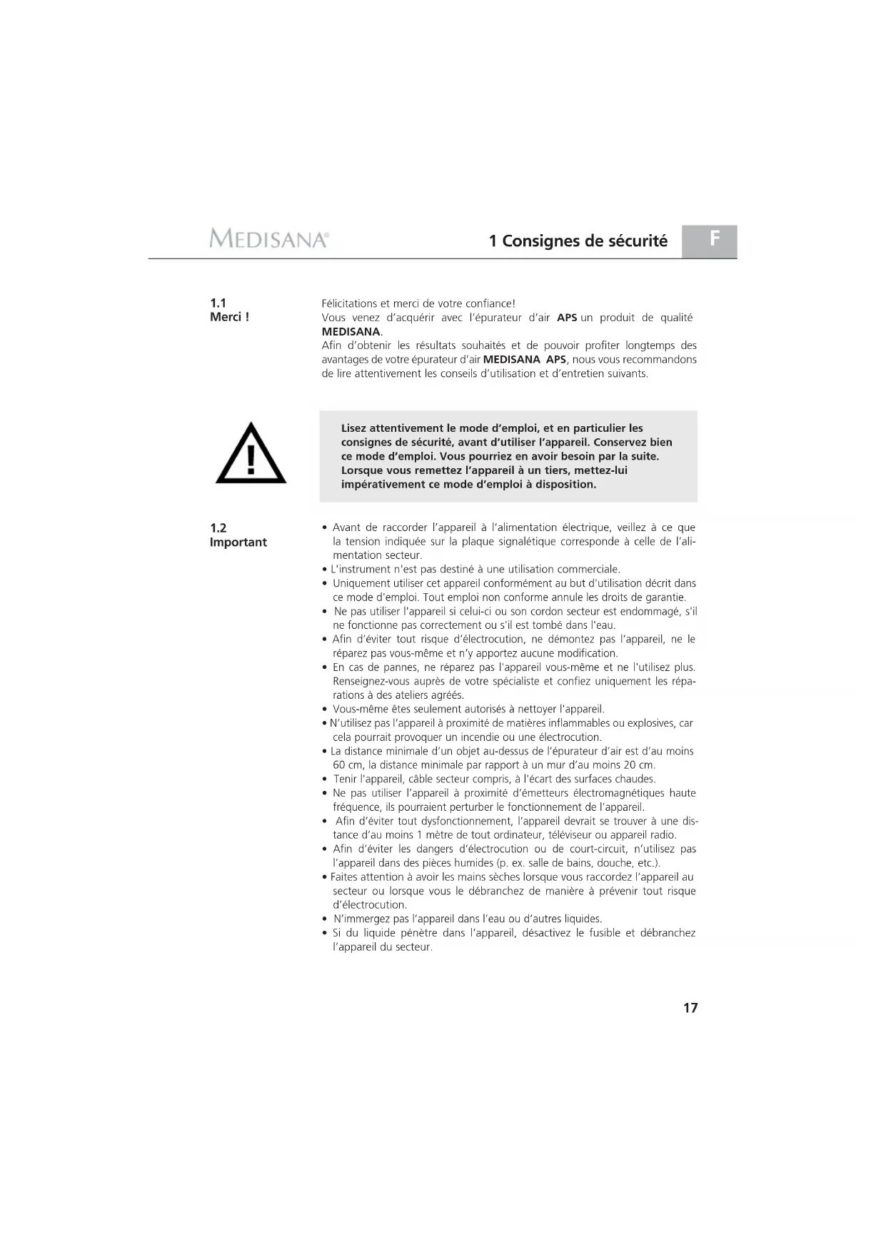 Merci ! Félicitations et merci de votre confiance! Vous venez d’acquérir avec l’épurateur d’air APS un produit de qualité MEDISANA. Afin d’obtenir les résultats souhaités et de pouvoir profiter longtemps des avantages de votre épurateur d’air MEDISANA APS, nous vous recommandons de lire attentivement les conseils d’utilisation et d’entretien suivants. Lisez attentivement le mode d’emploi, et en particulier les consignes de sécurité, avant d’utiliser l’appareil. Conservez bien ce mode d’emploi. Vous pourriez en avoir besoin par la suite. Lorsque vous remettez l’appareil à un tiers, mettez-lui impérativement ce mode d’emploi à disposition.
