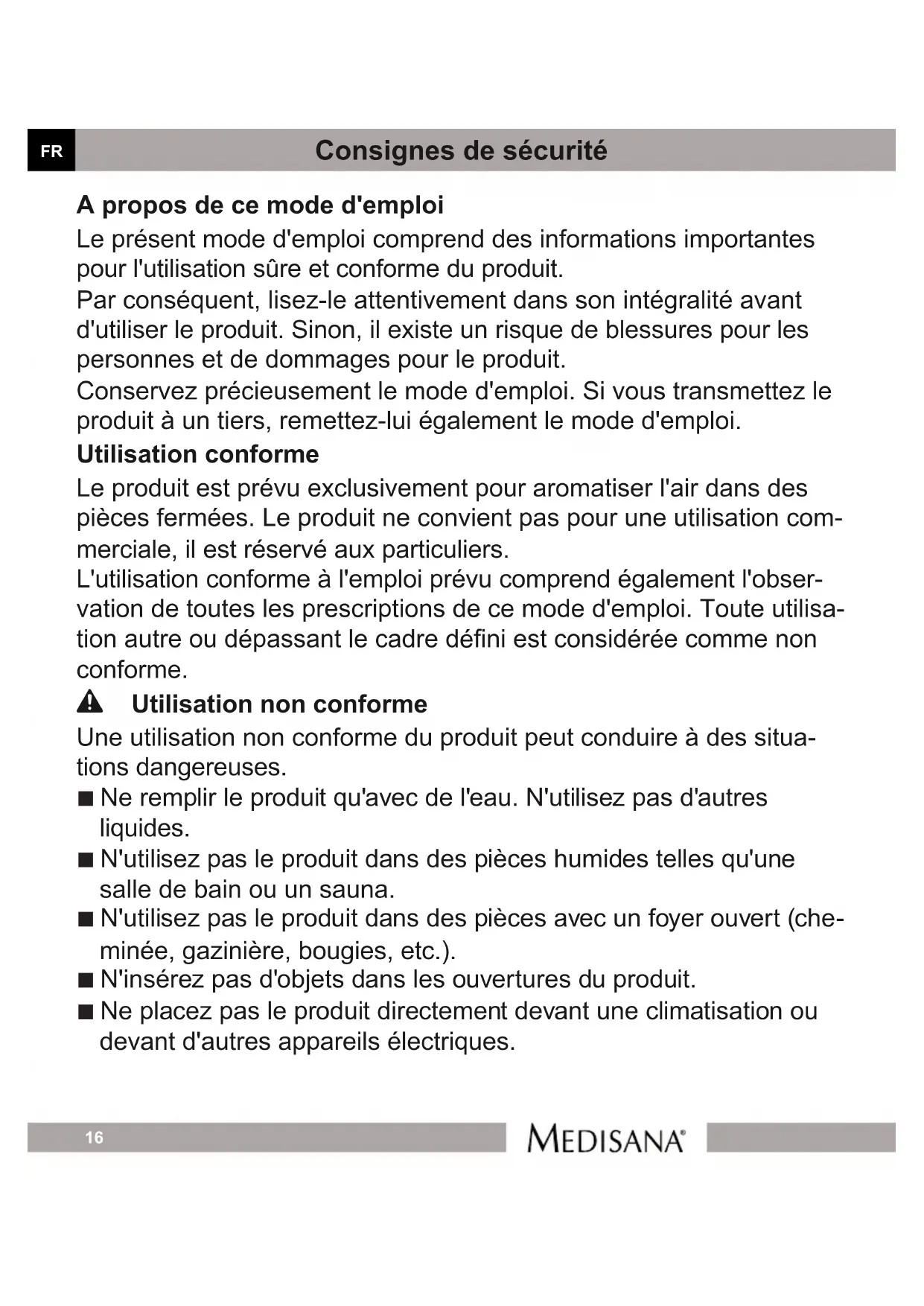 Consignes de sécurité ■ Débranchez toujours l'appareil avant d'ajouter ou de vider le pro- duit. ■ Débranchez l'appareil avant l'installation, le nettoyage et en cas de non-utilisation. ■ Videz le réservoir d'eau en cas de non-utilisation. ■ En cas de doute sur le fonctionnement, la sécurité ou le branche- ment du produit, adressez-vous au fabricant ou à un spécialiste. ■ Si le cordon d’alimentation(ou le bloc d’alimentation) est endom- magé, il doit être réparé que par Medisana, son service clients agréé ou être remplacé par une personne qualiée an d’éviter tout risque. L Installation Le contact du produit avec un liquide, de l'air humide ou le feu peut entraîner des blessures. ■ N'installez pas le produit dans des pièces à l'humidité élevée telles qu'une salle de bain ou un sauna. ■ Assurez-vous qu'aucun liquide ne puisse pénétrer à l'intérieur de l'appareil. Non seulement le produit pourrait être détruit, mais cela provoquerait en plus un risque d'incendie. ■ Protégez l'appareil des intempéries. Ne l'installez jamais en exté- rieur. ■ Ne mettez le produit que sur une surface plane. Si la surface est inclinée, l'eau du réservoir d'eau pourrait pénétrer à l'intérieur de l'appareil. ■ Faites attention à ce que les arrivées d'air en bas de l'appareil ne soient pas couvertes ni fermées.FR Art. 60084 19 Consignes d‘utilisation Fonctions Le diffuseur d'arômes est un diffuseur à parfums moderne, qui produit par une technologie d'ultra- sons, un brouillard n et répartit ainsi le parfum dans toute la pièce. Ce diffuseur d'arômes comprend les fonctions complémentaires suivantes : ■ Minuterie: Avec la minuterie, la diffusion du parfum s’arrête automatiquement après une durée sélectionnée. ■ LED: Dans le diffuseur d’arômes, il y a des LED intégrées qui s’allument de la couleur sélec- tionnée ou qui changent automatiquement de couleur. Boutons de commande Ce diffuseur d'arômes dispose de deux boutons de commande. Chaque pression des boutons est conrmée par un bip sonore. Bouton Fonction Mise en marche/Arrêt et bouton de la minuterie : Ce bouton permet de mettre en marche et d'arrêter le diffuseur d'arômes. La mise en marche n'est possible que si le réservoir d'eau est rempli correctement. En plus, avec le bouton de la minuterie, il est possible de régler la coupure automatique de l'appareil. Le réglage actuel est indiqué dans l'afchage au-dessus du bouton. Les réglages suivants sont possibles : 1 heure → 2 heures→ 3 heures→ Marche → Arrêt Bouton LED : En appuyant plusieurs fois sur le bouton LED, il est possible de changer le couleur de l'éclairage LED en bas de l'appareil. Les réglages de couleur suivants sont possibles : Changement de couleur → Sélection xe de la couleur → Gradation de la couleur sélec- tionnée. Les couleurs se suivent dans l'ordre suivant : orange, vert, bleu, rouge, jaune, pink, bleu clair et rose → Arrêt. Nettoyage et entretien ■ Pour ménager l'appareil, coupez-le pendant au moins 60 minutes après un fonctionnement perma- nent de trois heures. ■ Avant le nettoyage, débranchez l'appareil. ■ Videz l'appareil après toute utilisation, du côté de l'écoulement du réservoir, et essuyez le réservoir d'eau avec un chiffon. ■ Rincez le réservoir d'eau à l'eau claire, si vous voulez changer de parfum. Cela évitera de mélan- ger les parfums différents. ■ Nettoyez l'extérieur de l'appareil uniquement à l'aide d'un chiffon doux légèrement humide. Ensuite, frottez-le avec un chiffon doux et sec pour le sécher. ■ N'utilisez en aucun cas de brosse, d'outil pointu, d'essence, de diluant ou d'alcool pour le net- toyage.FR