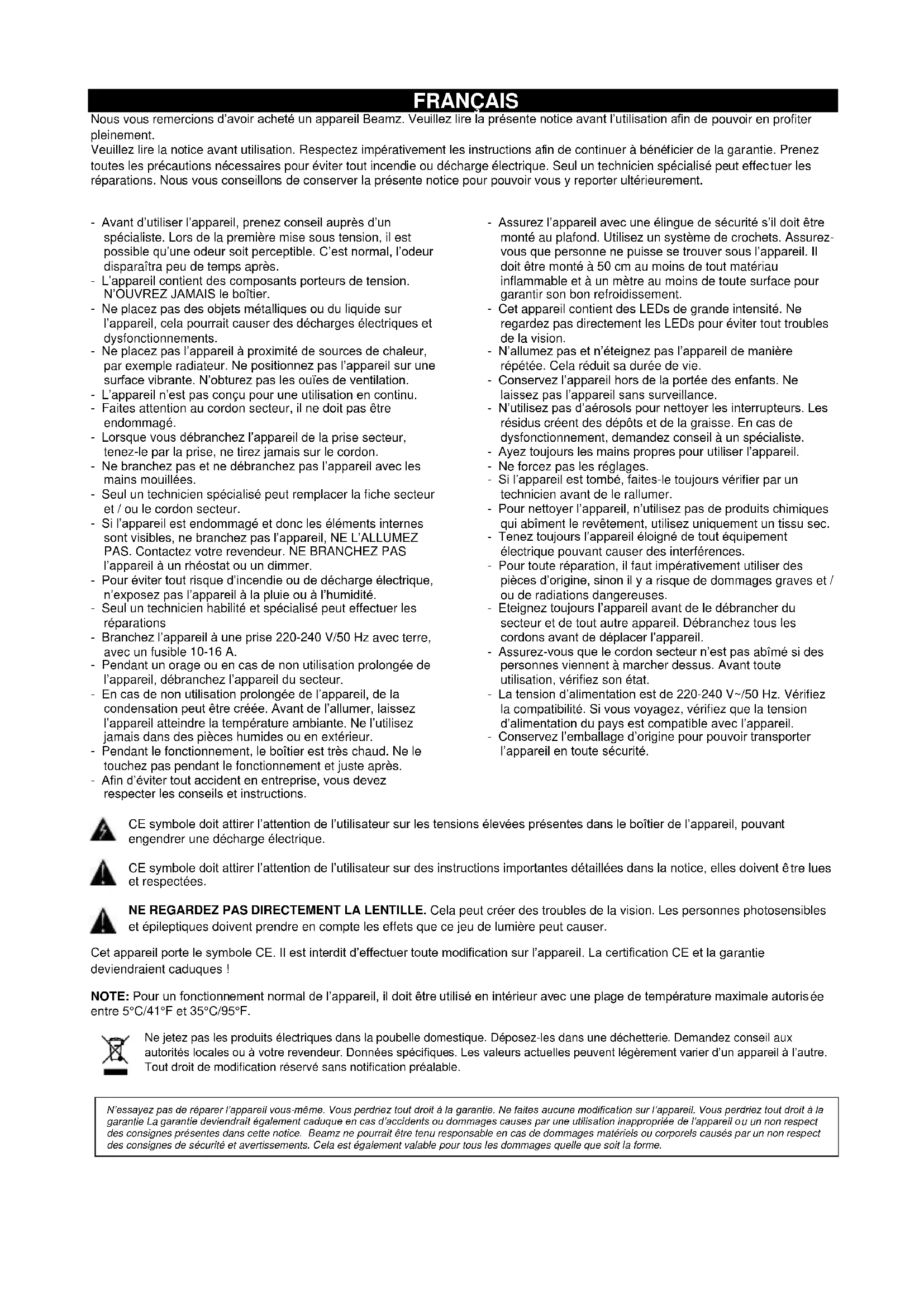 ATENCIÓN: Se recomienda encarecidamente que la limpieza interna sea llevada a cabo por trabajador cualificado!FRANÇAIS Nous vous remercions d’avoir acheté un appareil Beamz. Veuillez lire la présente notice avant l’utilisation afin de pouvoir en profiter pleinement. Veuillez lire la notice avant utilisation. Respectez impérativement les instructions afin de continuer à bénéficier de la garantie. Prenez toutes les précautions nécessaires pour éviter tout incendie ou décharge électrique. Seul un technicien spécialisé peut effectuer les réparations. Nous vous conseillons de conserver la présente notice pour pouvoir vous y reporter ultérieurement. - Avant d’utiliser l’appareil, prenez conseil auprès d’un spécialiste. Lors de la première mise sous tension, il est possible qu’une odeur soit perceptible. C’est normal, l’odeur disparaîtra peu de temps après. - L’appareil contient des composants porteurs de tension. N’OUVREZ JAMAIS le boîtier. - Ne placez pas des objets métalliques ou du liquide sur l’appareil, cela pourrait causer des décharges électriques et dysfonctionnements. - Ne placez pas l’appareil à proximité de sources de chaleur, par exemple radiateur. Ne positionnez pas l’appareil sur une surface vibrante. N’obturez pas les ouïes de ventilation. - L’appareil n’est pas conçu pour une utilisation en continu. - Faites attention au cordon secteur, il ne doit pas être endommagé. - Lorsque vous débranchez l’appareil de la prise secteur, tenez-le par la prise, ne tirez jamais sur le cordon. - Ne branchez pas et ne débranchez pas l’appareil avec les mains mouillées. - Seul un technicien spécialisé peut remplacer la fiche secteur et / ou le cordon secteur. - Si l’appareil est endommagé et donc les éléments internes sont visibles, ne branchez pas l’appareil, NE L’ALLUMEZ PAS. Contactez votre revendeur. NE BRANCHEZ PAS l’appareil à un rhéostat ou un dimmer. - Pour éviter tout risque d’incendie ou de décharge électrique, n’exposez pas l’appareil à la pluie ou à l’humidité. - Seul un technicien habilité et spécialisé peut effectuer les réparations - Branchez l’appareil à une prise 220-240 V/50 Hz avec terre, avec un fusible 10-16 A. - Pendant un orage ou en cas de non utilisation prolongée de l’appareil, débranchez l’appareil du secteur. - En cas de non utilisation prolongée de l’appareil, de la condensation peut être créée. Avant de l’allumer, laissez l’appareil atteindre la température ambiante. Ne l’utilisez jamais dans des pièces humides ou en extérieur. - Pendant le fonctionnement, le boîtier est très chaud. Ne le touchez pas pendant le fonctionnement et juste après. - Afin d’éviter tout accident en entreprise, vous devez respecter les conseils et instructions. - Assurez l’appareil avec une élingue de sécurité s’il doit être monté au plafond. Utilisez un système de crochets. Assurez- vous que personne ne puisse se trouver sous l’appareil. Il doit être monté à 50 cm au moins de tout matériau inflammable et à un mètre au moins de toute surface pour garantir son bon refroidissement. - Cet appareil contient des LEDs de grande intensité. Ne regardez pas directement les LEDs pour éviter tout troubles de la vision. - N’allumez pas et n’éteignez pas l’appareil de manière répétée. Cela réduit sa durée de vie. - Conservez l’appareil hors de la portée des enfants. Ne laissez pas l’appareil sans surveillance. - N’utilisez pas d’aérosols pour nettoyer les interrupteurs. Les résidus créent des dépôts et de la graisse. En cas de dysfonctionnement, demandez conseil à un spécialiste. - Ayez toujours les mains propres pour utiliser l’appareil. - Ne forcez pas les réglages. - Si l’appareil est tombé, faites-le toujours vérifier par un technicien avant de le rallumer. - Pour nettoyer l’appareil, n’utilisez pas de produits chimiques qui abîment le revêtement, utilisez uniquement un tissu sec. - Tenez toujours l’appareil éloigné de tout équipement électrique pouvant causer des interférences. - Pour toute réparation, il faut impérativement utiliser des pièces d’origine, sinon il y a risque de dommages graves et / ou de radiations dangereuses. - Eteignez toujours l’appareil avant de le débrancher du secteur et de tout autre appareil. Débranchez tous les cordons avant de déplacer l’appareil. - Assurez-vous que le cordon secteur n’est pas abîmé si des personnes viennent à marcher dessus. Avant toute utilisation, vérifiez son état. - La tension d’alimentation est de 220-240 V~/50 Hz. Vérifiez la compatibilité. Si vous voyagez, vérifiez que la tension d’alimentation du pays est compatible avec l’appareil. - Conservez l’emballage d’origine pour pouvoir transporter l’appareil en toute sécurité. CE symbole doit attirer l’attention de l’utilisateur sur les tensions élevées présentes dans le boîtier de l’appareil, pouvant engendrer une décharge électrique. CE symbole doit attirer l’attention de l’utilisateur sur des instructions importantes détaillées dans la notice, elles doivent être lues et respectées. NE REGARDEZ PAS DIRECTEMENT LA LENTILLE. Cela peut créer des troubles de la vision. Les personnes photosensibles et épileptiques doivent prendre en compte les effets que ce jeu de lumière peut causer. Cet appareil porte le symbole CE. Il est interdit d’effectuer toute modification sur l’appareil. La certification CE et la garantie deviendraient caduques ! NOTE: Pour un fonctionnement normal de l’appareil, il doit être utilisé en intérieur avec une plage de température maximale autorisée entre 5°C/41°F et 35°C/95°F. Ne jetez pas les produits électriques dans la poubelle domestique. Déposez-les dans une déchetterie. Demandez conseil aux autorités locales ou à votre revendeur. Données spécifiques. Les valeurs actuelles peuvent légèrement varier 