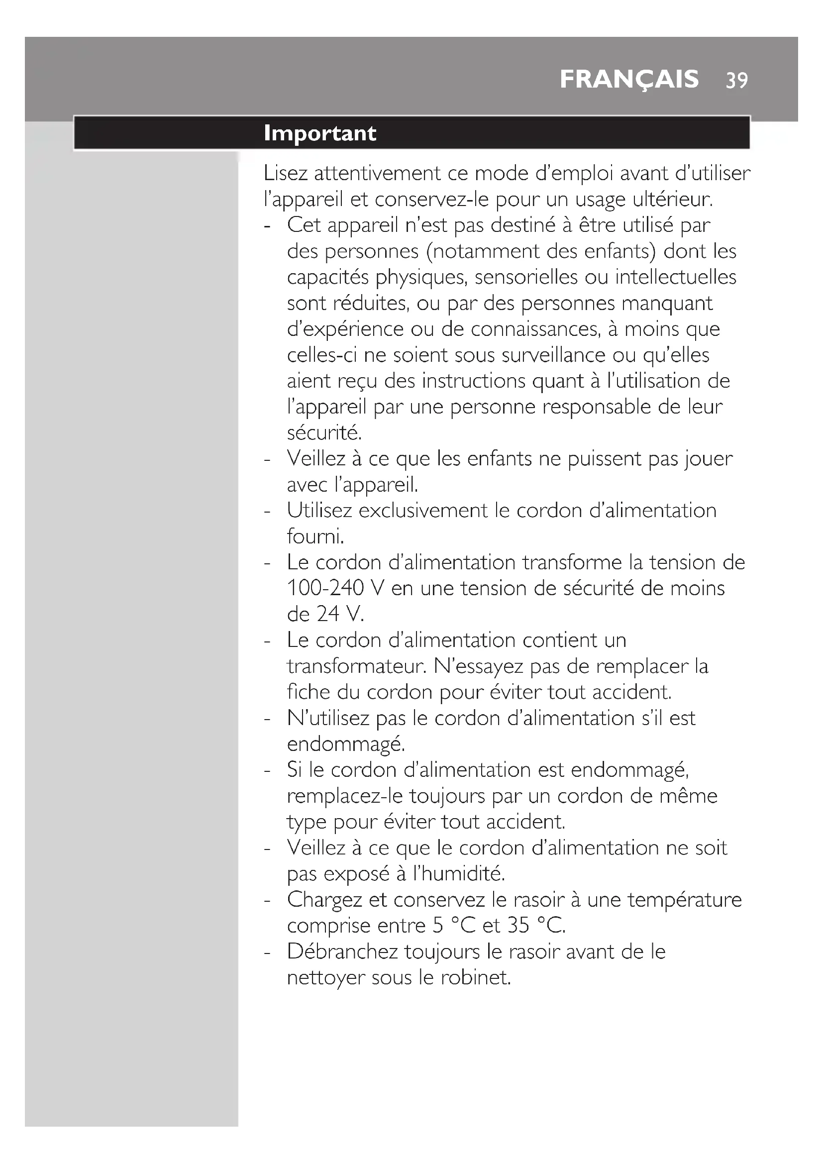 Español3839 Important Lisez attentivement ce mode d’emploi avant d’utiliser l’appareil et conservez-le pour un usage ultérieur. Cet appareil n’est pas destiné à être utilisé par des personnes (notamment des enfants) dont les capacités physiques, sensorielles ou intellectuelles sont réduites, ou par des personnes manquant d’expérience ou de connaissances, à moins que celles-ci ne soient sous surveillance ou qu’elles aient reçu des instructions quant à l’utilisation de l’appareil par une personne responsable de leur sécurité. Veillez à ce que les enfants ne puissent pas jouer avec l’appareil. Utilisez exclusivement le cordon d’alimentation fourni. Le cordon d’alimentation transforme la tension de 100-240 V en une tension de sécurité de moins de 24 V. Le cordon d’alimentation contient un transformateur. N’essayez pas de remplacer la che du cordon pour éviter tout accident. N’utilisez pas le cordon d’alimentation s’il est endommagé. Si le cordon d’alimentation est endommagé, remplacez-le toujours par un cordon de même type pour éviter tout accident. Veillez à ce que le cordon d’alimentation ne soit pas exposé à l’humidité. Chargez et conservez le rasoir à une température comprise entre 5 °C et 35 °C. Débranchez toujours le rasoir avant de le nettoyer sous le robinet.