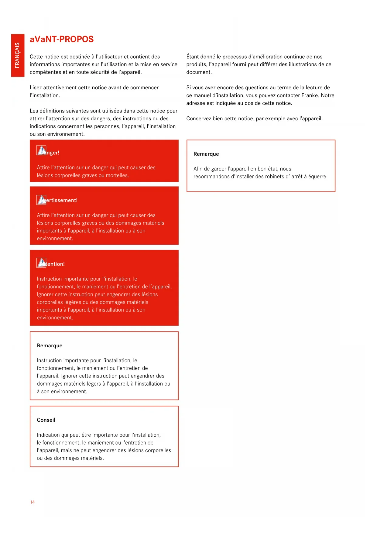 Si vous avez encore des questions au terme de la lecture de ce manuel d'installation, vous pouvez contacter Franke. Notre adresse est indiquée au dos de cette notice.