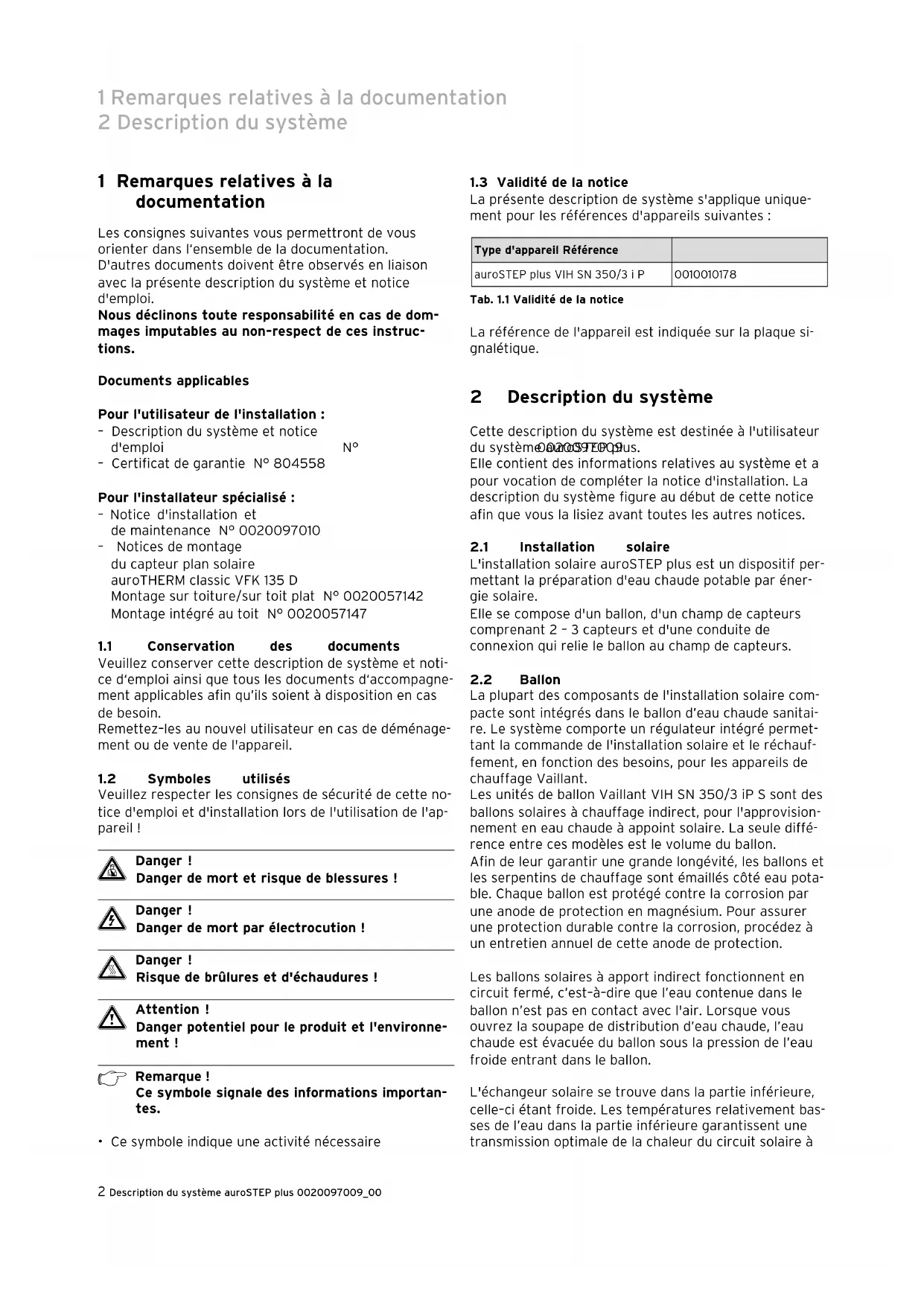 BEFR2 Notice d'emploi auroSTEP plus 0020097009_00 1 Remarques relatives à la documentation Les consignes suivantes vous permettront de vous orienter dans l‘ensemble de la documentation. En liaison avec la présente notice d'emploi, d’autres do- cuments doivent également être observés. Nous déclinons toute responsabilité en cas de dom- mages imputables au non–respect de ces instruc- tions. Documents applicables Pour l'utilisateur de l'installation : – Description du système et notice d'emploi N° 0020097009 – Certificat de garantie N° 804558 Pour l'installateur spécialisé : – Description du système et notice d'emploi N° 0020097009 – Notice d'installation et de maintenance N° 0020097010 – Notices de montage du capteur plan solaire auroTHERM classic VFK 135 D Montage sur toiture/sur toit plat N° 0020057142 Montage intégré au toit N° 0020057147 Lors de l’utilisation de l'installation solaire auroSTEP plus, veuillez respecter toutes les notices d’emploi des éléments et composants de l'installation. Ces notices d'emploi sont fournies avec les différents éléments et équipements complémentaires de l'installation.