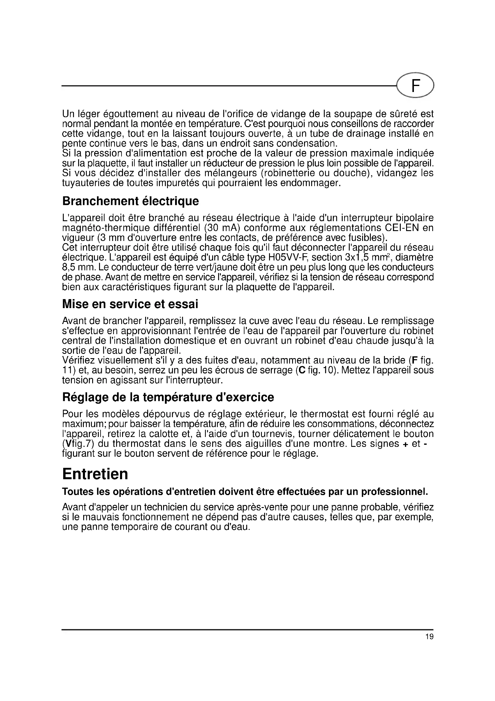 tension en agissant sur l'interrupteur. Réglage de la température d'exercice Pour les modèles dépourvus de réglage extérieur, le thermostat est fourni réglé au maximum; pour baisser la température, afin de réduire les consommations, déconnectez l'appareil, retirez la calotte et, à l'aide d'un tournevis, tourner délicatement le bouton (Vfig.7) du thermostat dans le sens des aiguilles d'une montre. Les signes + et - figurant sur le bouton servent de référence pour le réglage. Entretien Toutes les opérations d'entretien doivent être effectuées par un professionnel. Avant d'appeler un technicien du service après-vente pour une panne probable, vérifiez si le mauvais fonctionnement ne dépend pas d'autre causes, telles que, par exemple, une panne temporaire de courant ou d'eau.20 Remplacement de pièces détachées Débranchez l'appareil du réseau électrique. Enlevez le capot pour intervenir sur les parties électriques (fig. 8). Pour agir sur le thermostat et la carte (fig. 9), déconnectez- les du cåble d’alimentation et enlevez-les du logement. Avant toute opération sur l'élément chauffant et sur l'anode, il faut d'abord vidanger l'appareil, comme suit: attendez le refroidissement de l'eau contenue dans l'appareil, fermez le robinet central et faites sortir l'eau par le tuyau d'entrée, après avoir ouvert le robinet de vidange et un robinet d'eau chaude. Dévissez les 5 boulons (C fig. 10) et enlevez la bride (F fig. 11), à laquelle sont accouplés l'élément chauffant et l'anode. Lors de la repose, ayez soin de remettre le joint de la bride, le thermostat et l'élément chauffant à leurs positions d'origine (fig. 10). Après chaque démontage, le joint de la bride devrait être remplacé (Z fig. 12). Respectez la polarité des connexions électriques, comme indiqué aux figures 10 et 13. Entretien régulier Pour assurer les meilleures performances de l'appareil il est recommandé de procéder au détartrage de l'élément chauffant (R fig. 12) au moins tous les deux ans. Cette opération doit être effectuée sur la résistance (retirée de l'appareil), à l'aide d'acides spécialement prévus à cet effet, ou bien en effritant l'incrustation calcaire en prenant soin de ne pas abîmer le revêtement de l'élément chauffant. Pour assurer la meilleure durée de vie de l'appareil, l'anode au magnésium (N fig. 12) doit être remplacée tous les deux ans. Pour l'enlever, dévissez-la da la patte de support après avoir démonté l'élément chauffant. Sécurité bipolaire En cas de surchauffe anormale de l'eau, un disjoncteur thermique de sûreté, conforme aux normes CEI-EN, interrompt le circuit électrique sur les deux phases d'alimentation de l'élément chauffant ; dans ce cas, adressez-vous au Service Après Vente. Clapet de sûreté Vous pouvez soulever le clapet de sûreté à levier monté sur certains appareils et l’utiliser pour: - vider l’appareil, si nécessaire, - vérifier périodiquement (tous les mois), le bon fonctionnement du clapet. Informations utiles Pendant la montée en température, des bruits peuvent se produire normalement à l'intérieur du chauffe-eau, du fait de l'échange de chaleur entre l'élément chauffant et l'eau en contact avec celui-ci. S'il n'y a pas d'eau chaude aux points de puisage, vérifiez si les raccordements électrique et hydraulique sont conformes aux indications des paragraphes correspondants, ou bien contrôlez sur le thermostat, après l'avoir retiré, la continuité des phases entre les bornes et les fastons correspondants. En cas d'interruption, il est probable que la sécurité bipolaire est entrée en action (consultez le paragraphe " Entretien régulier "). Pour le fonctionnement correct du système de protection galvanique du chauffe-eau, la dureté permanente de l'eau ne doit pas être inférieure à 12° fr. Pendant le fonctionnement normal de l'appareil, les raccordements hydrauliques peuvent atteindre des températures élevées. F21