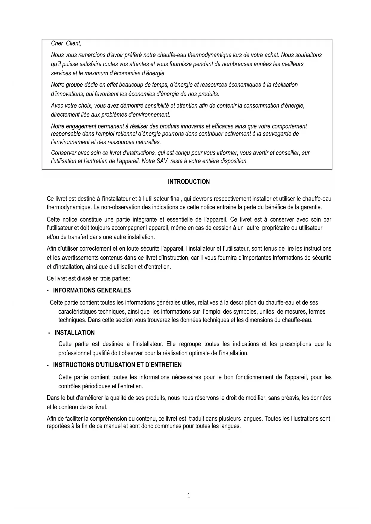 NL1 Cher Client, Nous vous remercions d’avoir préféré notre chauffe-eau thermodynamique lors de votre achat. Nous souhaitons qu’il puisse satisfaire toutes vos attentes et vous fournisse pendant de nombreuses années les meilleurs services et le maximum d’économies d’énergie. Notre groupe dédie en effet beaucoup de temps, d’énergie et ressources économiques à la réalisation d’innovations, qui favorisent les économies d’énergie de nos produits. Avec votre choix, vous avez démontré sensibilité et attention afin de contenir la consommation d’énergie, directement liée aux problèmes d’environnement. Notre engagement permanent à réaliser des produits innovants et efficaces ainsi que votre comportement responsable dans l’emploi rationnel d’énergie pourrons donc contribuer activement à la sauvegarde de l’environnement et des ressources naturelles. Conserver avec soin ce livret d’instructions, qui est conçu pour vous informer, vous avertir et conseiller, sur l’utilisation et l’entretien de l’appareil. Notre SAV reste à votre entière disposition. INTRODUCTION Ce livret est destiné à l’installateur et à l’utilisateur final, qui devrons respectivement installer et utiliser le chauffe-eau thermodynamique. La non-observation des indications de cette notice entraine la perte du bénéfice de la garantie. Cette notice constitue une partie intégrante et essentielle de l’appareil. Ce livret est à conserver avec soin par l’utilisateur et doit toujours accompagner l’appareil, même en cas de cession à un autre propriétaire ou utilisateur et/ou de transfert dans une autre installation. Afin d’utiliser correctement et en toute sécurité l’appareil, l’installateur et l’utilisateur, sont tenus de lire les instructions et les avertissements contenus dans ce livret d’instruction, car il vous fournira d’importantes informations de sécurité et d’installation, ainsi que d’utilisation et d’entretien. Ce livret est divisé en trois parties: - INFORMATIONS GENERALES Cette partie contient toutes les informations générales utiles, relatives à la description du chauffe-eau et de ses caractéristiques techniques, ainsi que les informations sur l’emploi des symboles, unités de mesures, termes techniques. Dans cette section vous trouverez les données techniques et les dimensions du chauffe-eau. - INSTALLATION Cette partie est destinée à l’installateur. Elle regroupe toutes les indications et les prescriptions que le professionnel qualifié doit observer pour la réalisation optimale de l’installation.