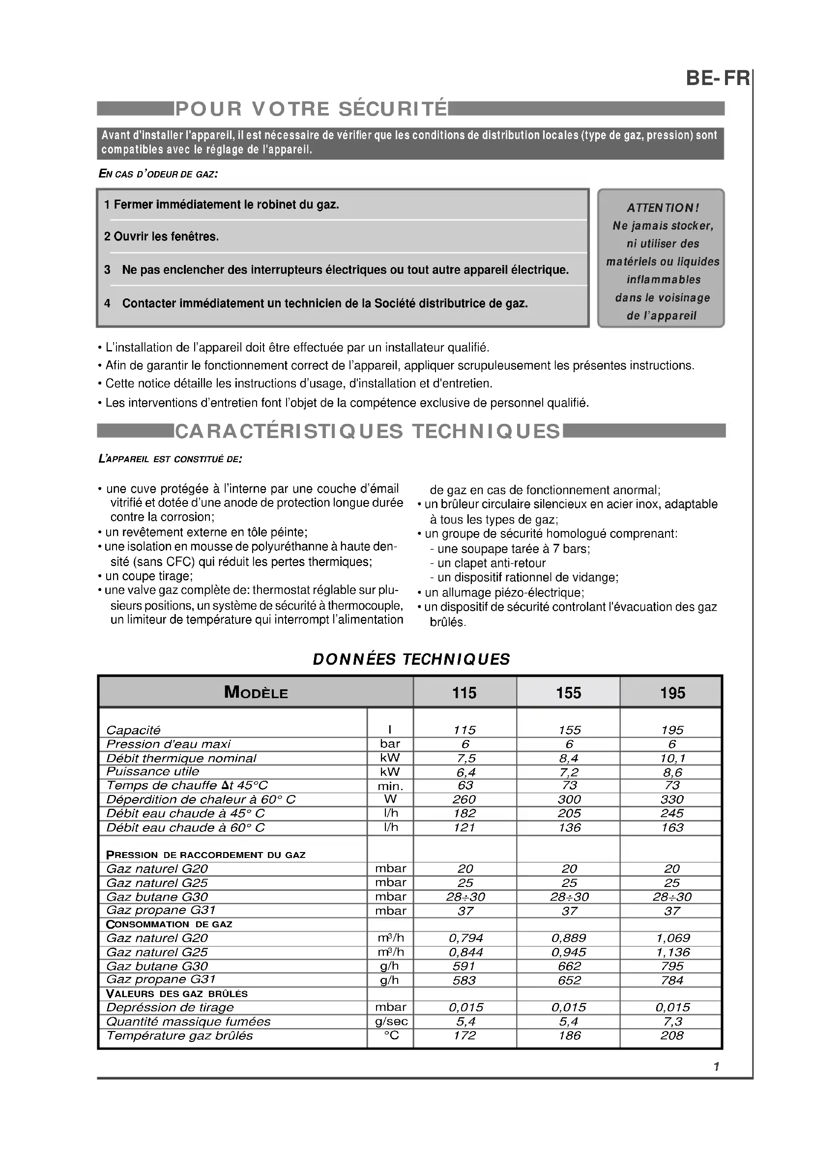de gaz en cas de fonctionnement anormal;• un brûleur circulaire silencieux en acier inox, adaptableà tous les types de gaz;• un groupe de sécurité homologué comprenant:- une soupape tarée à 7 bars;- un clapet anti-retour- un dispositif rationnel de vidange;• un allumage piézo-électrique;• un dispositif de sécurité controlant l'évacuation des gazbrûlés. Avant d'installer l'appareil, il est nécessaire de vérifier que les conditions de distribution locales (type de gaz, pression) sont compatibles avec le réglage de l'appareil.2 BE-FR