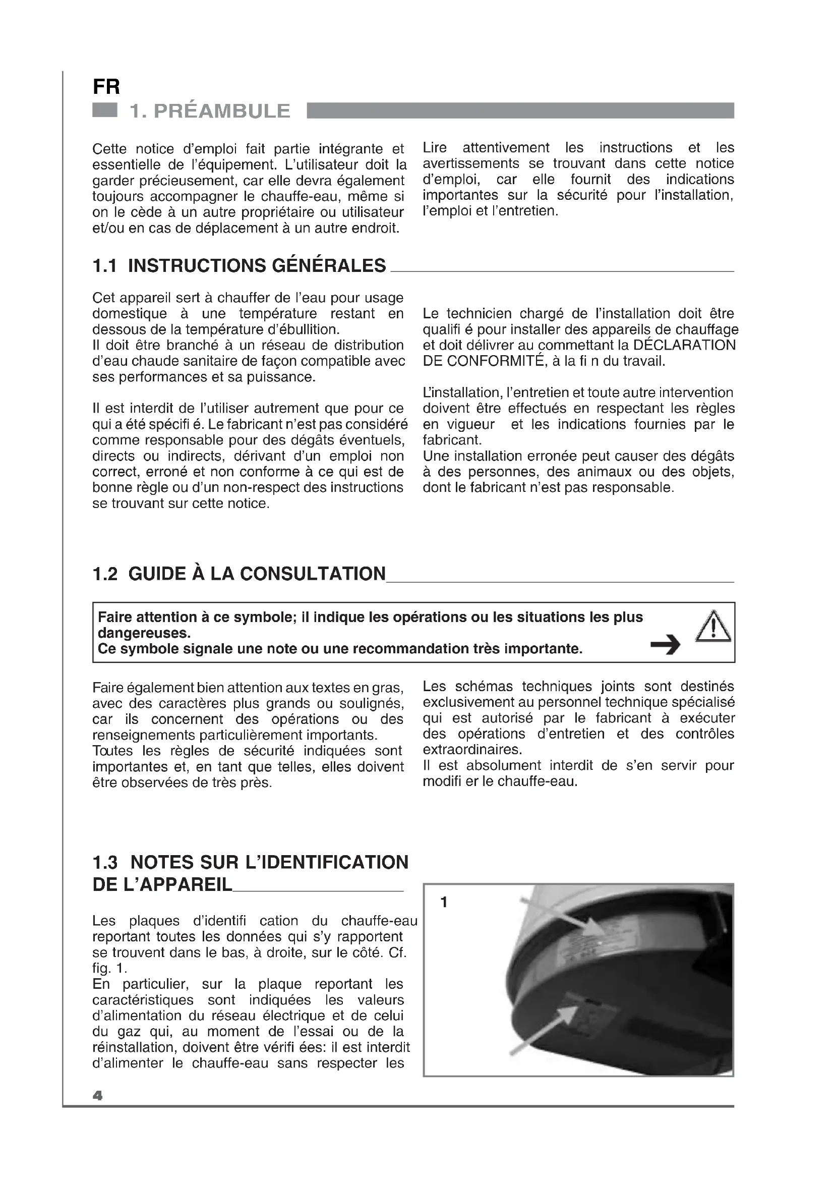 Les plaques d’identifi cation du chauffe-eau reportant toutes les données qui s’y rapportent se trouvent dans le bas, à droite, sur le côté. Cf. fi g . 1. En particulier, sur la plaque reportant les caractéristiques sont indiquées les valeurs d’alimentation du réseau électrique et de celui du gaz qui, au moment de l’essai ou de la réinstallation, doivent être vérifi ées: il est interdit d’alimenter le chauffe-eau sans respecter les5