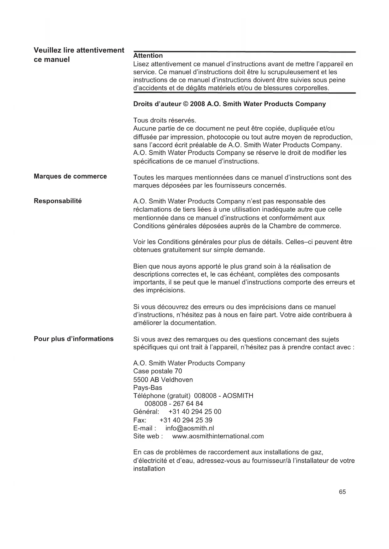 90Pour l'enregistrement de votre garantie, vous devez retourner la carte de garantie annexée et un certicat de garantie vous sera ensuite renvoyé. Ce certicat donne au propriétaire d'un chauffe-eau livré par A.O. Smith Water Products Company B.V. de Veldhoven, Pays-Bas (ci-après "A.O. Smith") le droit à la garantie détaillée ci-après qui lie A.O. Smith envers le propriétaire. Si, durant l'année suivant la date initiale d'installation d'un chauffe-eau livré par A.O. Smith après examen par et sur l'appréciation exclusive de A.O. Smith, toute partie ou pièce, à l'exception de la cuve, ne fonctionne pas ou ne fonctionne pas correctement suite à des vices de construction ou de matériau, A.O. Smith remplacera ou réparera la partie ou pièce défectueuse. La garantie visée aux articles 1 et 2 est valable exclusivement si les conditions suivantes sont remplies: a. Le chauffe-eau est installé compte tenu des prescriptions d’installation appliquées par A.O. Smith pour un modèle spécique et conformément aux arrêtés, prescriptions et règlements ofciels en ce qui concerne les installations et les constructions. b. Le chauffe-eau reste installé à l’endroit initial. c. Il est fait usage exclusivement d’eau potable, circulant librement en tout temps, tandis que la cuve est à l’abri des effets dégradants de tartre et de dépôt calcaire (utilisation obligatoire d’un échangeur thermique pour réchauffement indirect d’eau salée ou corrosive). d. Un entretien préventif permet d’éliminer tout dépôt calcaire dans la cuve. e. Les températures de l’eau du chauffe-eau n’excèdent pas le réglage maximum des thermostats qui composent le chauffe-eau. f. La pression hydraulique et / ou la charge thermique n’excèdent pas les maxima indiqués sur la plaque signalétique du chauffe-eau. g. Le chauffe-eau est placé dans un environnement non corrosif. h. Le chauffe-eau est pourvu d’un groupe de sécurité approuvé à cette n par une autorité compétente, de capacité sufsante, n’excédant pas la pression de fonctionnement telle qu’indiquée sur le chauffe-eau, ainsi qu’éventuellement d’une soupape de pression et température montée conformément aux prescriptions de A.O. Smith relatives au modèle spécique de chauffe-eau et compte tenu des prescriptions et règlements locaux ofciels.