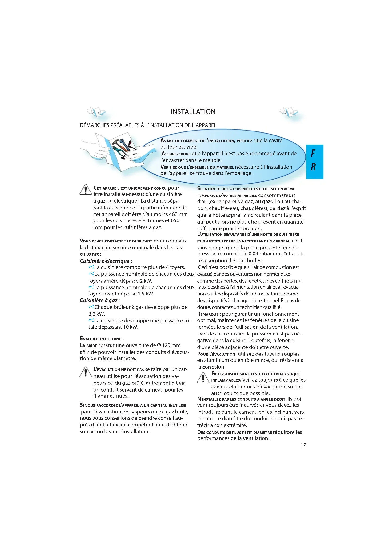 INFLAMMABLES. Veillez toujours à ce que les canaux et conduits d’évacuation soient aussi courts que possible.