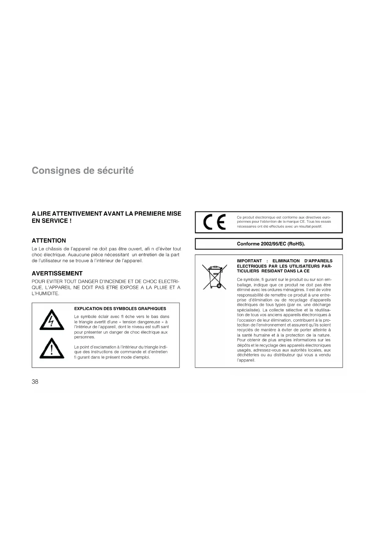 Le symbole éclair avec fl èche vers le bas dans le triangle avertit d’une « tension dangereuse » à l’intérieur de l’appareil, dont le niveau est suffi sant pour présenter un danger de choc électrique aux personnes. Le point d’exclamation à l’intérieur du triangle indi- que des instructions de commande et d’entretien fi gurant dans le présent mode d’emploi. AVERTISSEMENT POUR EVITER TOUT DANGER D’INCENDIE ET DE CHOC ELECTRI- QUE, L’APPAREIL NE DOIT PAS ETRE EXPOSE A LA PLUIE ET A L’HUMIDITE.
