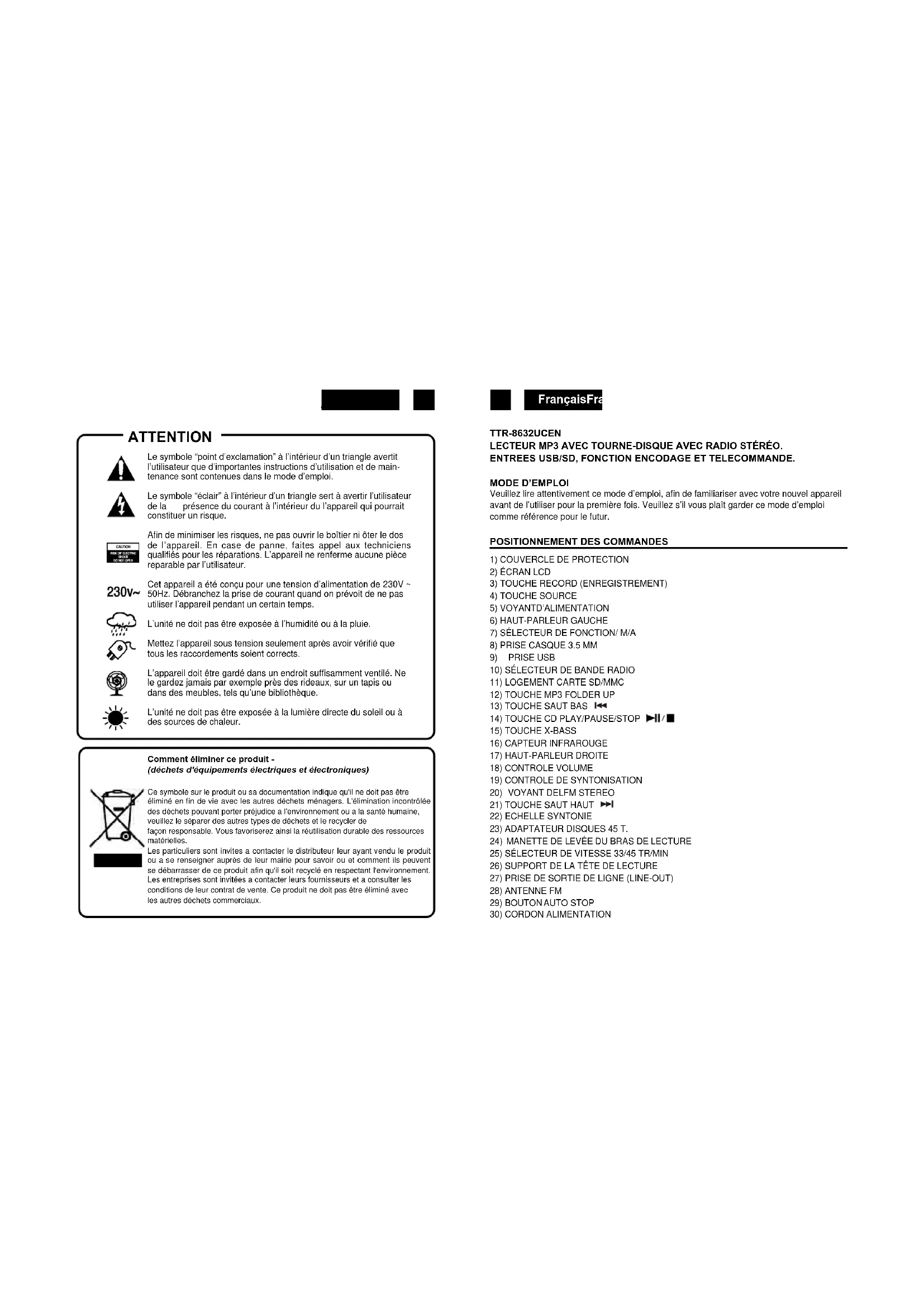 TTR8632UCEN - Platine disque ROADSTAR - Notice d'utilisation et mode d'emploi gratuit