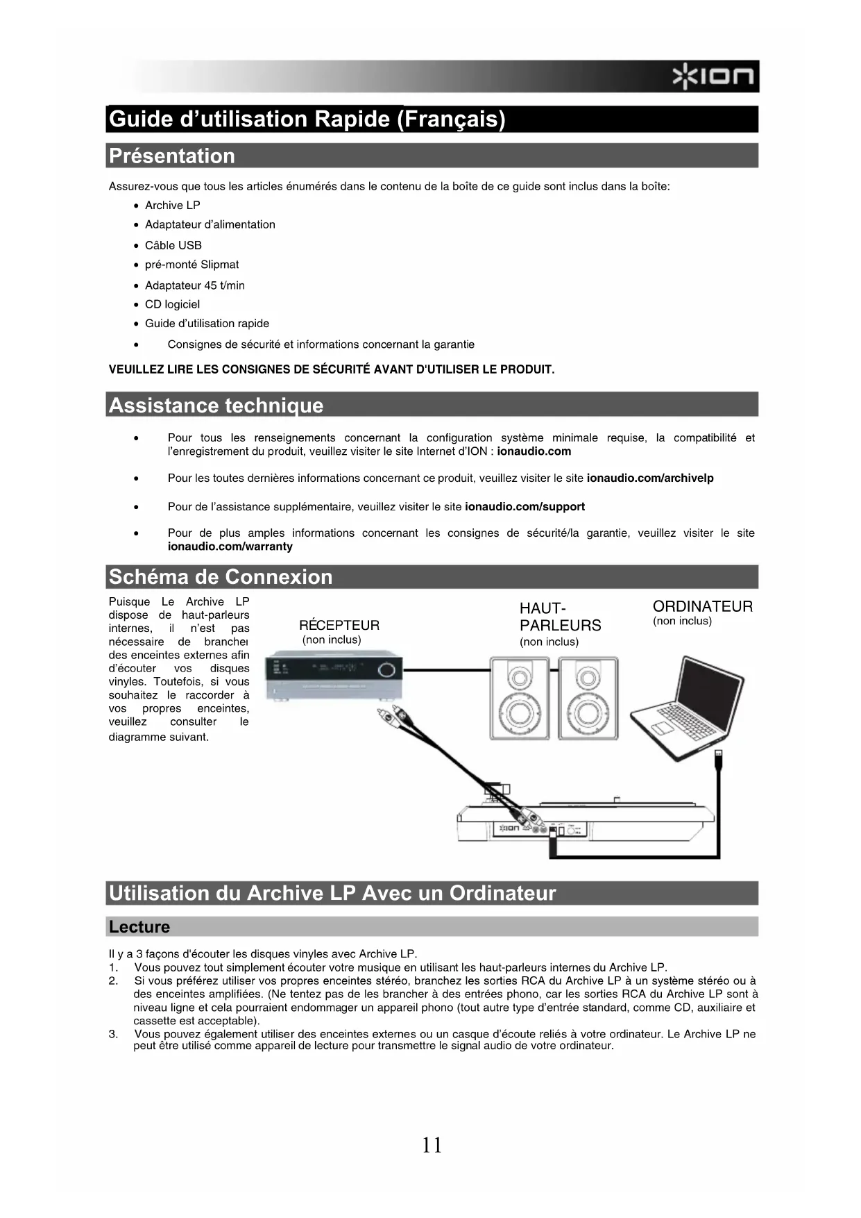 • Pour de l'assistance supplémentaire, veuillez visiter le site ionaudio.com/support - Pour de plus amples informations concernant les consignes de sécurité/la garantie, veuillez visiter le site ionaudio.com/warranty