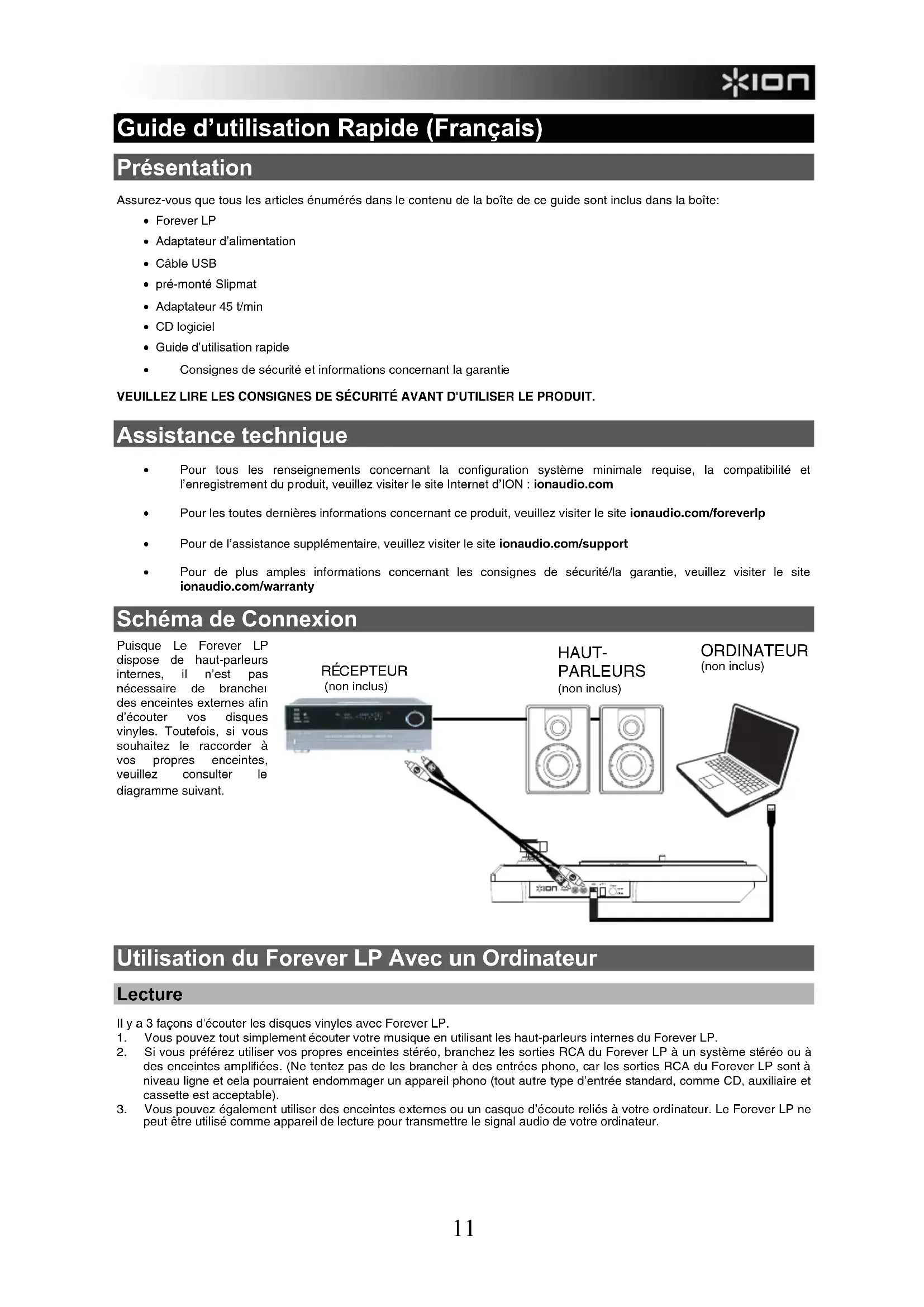 ANTES DE DEVOLVER EL PRODUCTO, comuníquese con Ion Audio para solicitar soporte técnico.11 Guide d’utilisation Rapide (Français) Présentation Assurez-vous que tous les articles énumérés dans le contenu de la boîte de ce guide sont inclus dans la boîte: • Forever LP • Adaptateur d’alimentation • Câble USB • pré-monté Slipmat • Adaptateur 45 t/min • CD logiciel • Guide d’utilisation rapide