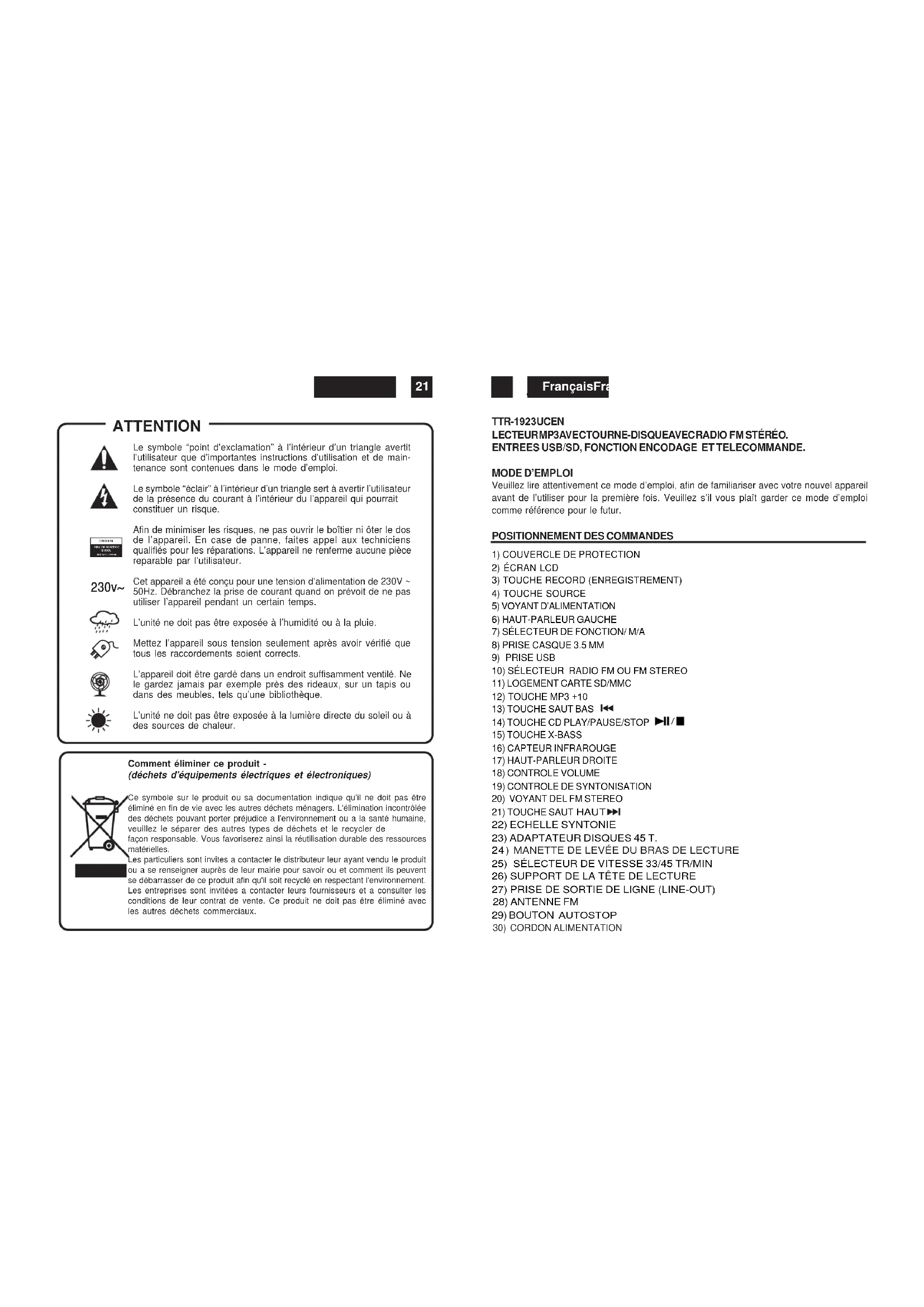 Le symbole “point d’exclamation” à l’intérieur d’un triangle avertit l’utilisateur que d’importantes instructions d’utilisation et de main- tenance sont contenues dans le mode d’emploi. Le symbole “éclair” à l’intérieur d’un triangle sert à avertir l’utilisateur de la présence du courant à l’intérieur du l’appareil qui pourrait constituer un risque. Afin de minimiser les risques, ne pas ouvrir le boîtier ni ôter le dos de l’appareil. En case de panne, faites appel aux techniciens qualifiés pour les réparations. L’appareil ne renferme aucune pièce reparable par l’utilisateur. Cet appareil a été conçu pour une tension d’alimentation de 230V ~ 50Hz. Débranchez la prise de courant quand on prévoit de ne pas utiliser l’appareil pendant un certain temps. L’unité ne doit pas être exposée à l’humidité ou à la pluie. Mettez l’appareil sous tension seulement après avoir vérifié que tous les raccordements soient corrects. L’appareil doit être gardé dans un endroit suffisamment ventilé. Ne le gardez jamais par exemple près des rideaux, sur un tapis ou dans des meubles, tels qu’une bibliothèque. L’unité ne doit pas être exposée à la lumière directe du soleil ou à des sources de chaleur. 230v~ Comment éliminer ce produit - (déchets d'équipements électriques et électroniques) Ce symbole sur le produit ou sa documentation indique qu'il ne doit pas êtreéliminé en fin de vie avec les autres déchets ménagers. L'élimination incontrôléedes déchets pouvant porter préjudice a l'environnement ou a la santé humaine,veuillez le séparer des autres types de déchets et le recycler defaçon responsable. Vous favoriserez ainsi la réutilisation durable des ressourcesmatérielles.Les particuliers sont invites a contacter le distributeur leur ayant vendu le produitou a se renseigner auprès de leur mairie pour savoir ou et comment ils peuventse débarrasser de ce produit afin qu'il soit recyclé en respectant l'environnement.Les entreprises sont invitées a contacter leurs fournisseurs et a consulter lesconditions de leur contrat de vente. Ce produit ne doit pas être éliminé avecles autres déchets commerciaux. TTR-1923UCEN LECTEUR MP3 AVEC TOURNE-DISQUE AVEC RADIO FM STÉRÉO. ENTREES USB/SD, FONCTION ENCODAGE ET TELECOMMANDE.