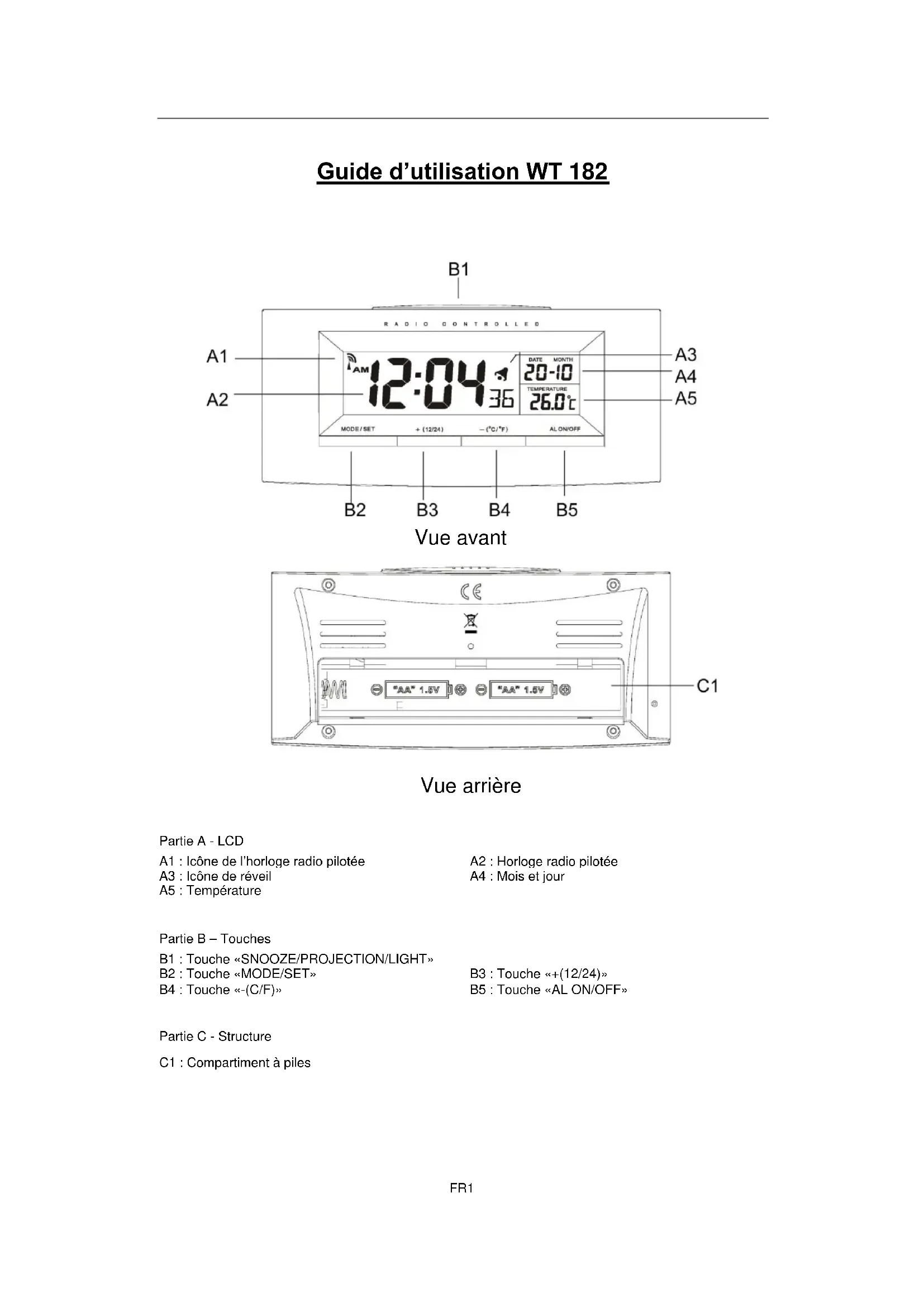 - Appuyez sur la touche «SNOOZE/LIGHT» (B1), pour activer le rétroéclairage pendant 5 secondes