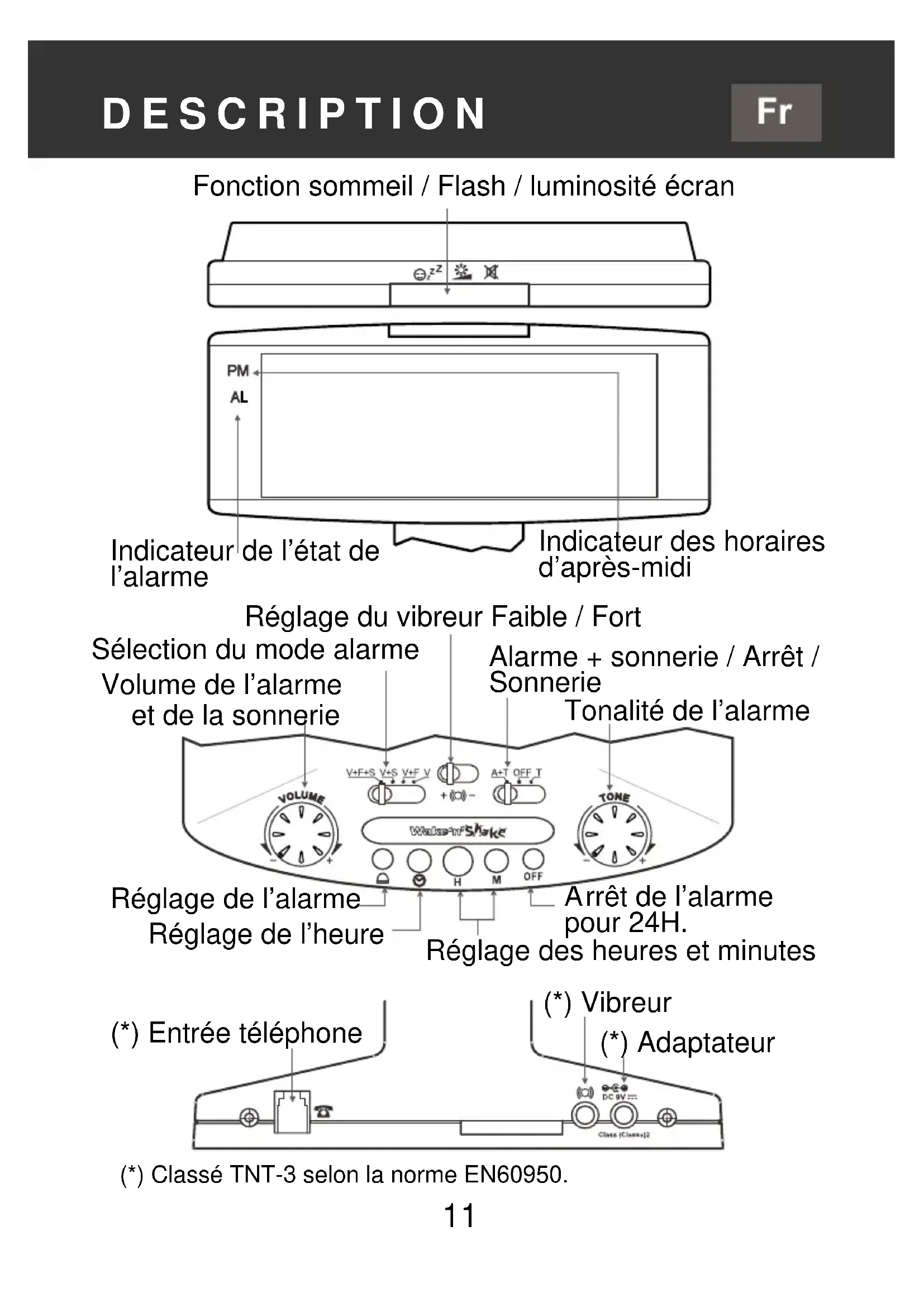 Fonction sommeil / Flash / luminosité écran Indicateur de l’état de l’alarme Indicateur des horaires d’après-midi Réglage du vibreur Faible / Fort Sélection du mode alarme