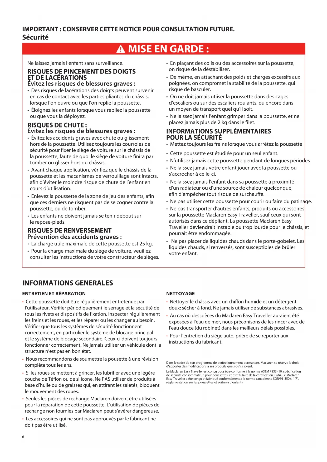 - Ne pas placer de liquides chauds dans le porte-gobelet. Les liquides chauds, si renversés, sont susceptibles de brûler votre enfant. Sécurité IMPORTANT : CONSERVER CETTE NOTICE POUR CONSULTATION FUTURE. INFORMATIONS GENERALES
