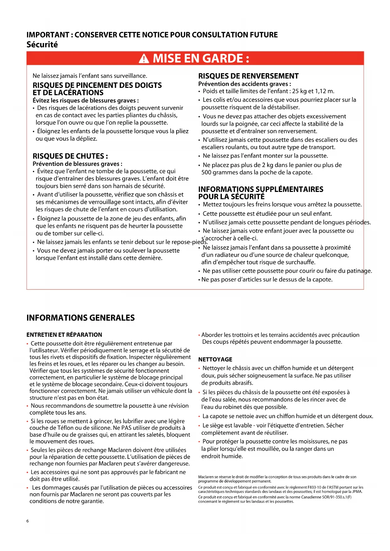 - Pour protéger la poussette contre les moisissures, ne pas la plier lorsqu’elle est mouillée, ou la ranger dans un endroit humide. Maclaren se réserve le droit de modifier la conception de tous ses produits dans le cadre de son programme de développement permanent.Ce produit est conçu et fabriqué en conformité avec le règlement F833-10 de l’ASTM portant sur les caractéristiques techniques standards des landaus et des poussettes; il est homologué par la JPMA.Ce produit est conçu et fabriqué en conformité avec la norme Canadienne SOR/91-350.s.1(F) concernant le règlement sur les landaus et les poussettes.B