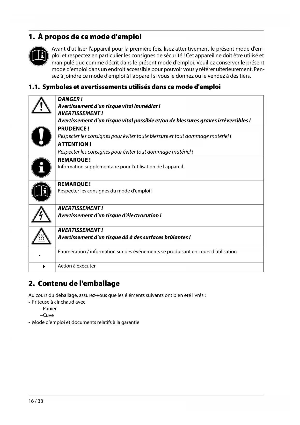 Avant d'utiliser l'appareil pour la première fois, lisez attentivement le présent mode d'em- ploi et respectez en particulier les consignes de sécurité ! Cet appareil ne doit être utilisé et manipulé que comme décrit dans le présent mode d'emploi. Veuillez conserver le présent mode d'emploi dans un endroit accessible pour pouvoir vous y référer ultérieurement. Pen- sez à joindre ce mode d'emploi à l'appareil si vous le donnez ou le vendez à des tiers. 1.1. Symboles et avertissements utilisés dans ce mode d'emploi DANGER! Avertissement d'un risque vital immédiat ! AVERTISSEMENT! Avertissement d'un risque vital possible et/ou de blessures graves irréversibles! PRUDENCE ! Respecter les consignes pour éviter toute blessure et tout dommage matériel ! ATTENTION! Respecter les consignes pour éviter tout dommage matériel ! REMARQUE ! Information supplémentaire pour l'utilisation de l'appareil. REMARQUE ! Respecter les consignes du mode d'emploi ! AVERTISSEMENT! Avertissement d'un risque d'électrocution ! AVERTISSEMENT! Avertissement d'un risque dû à des surfaces brûlantes !