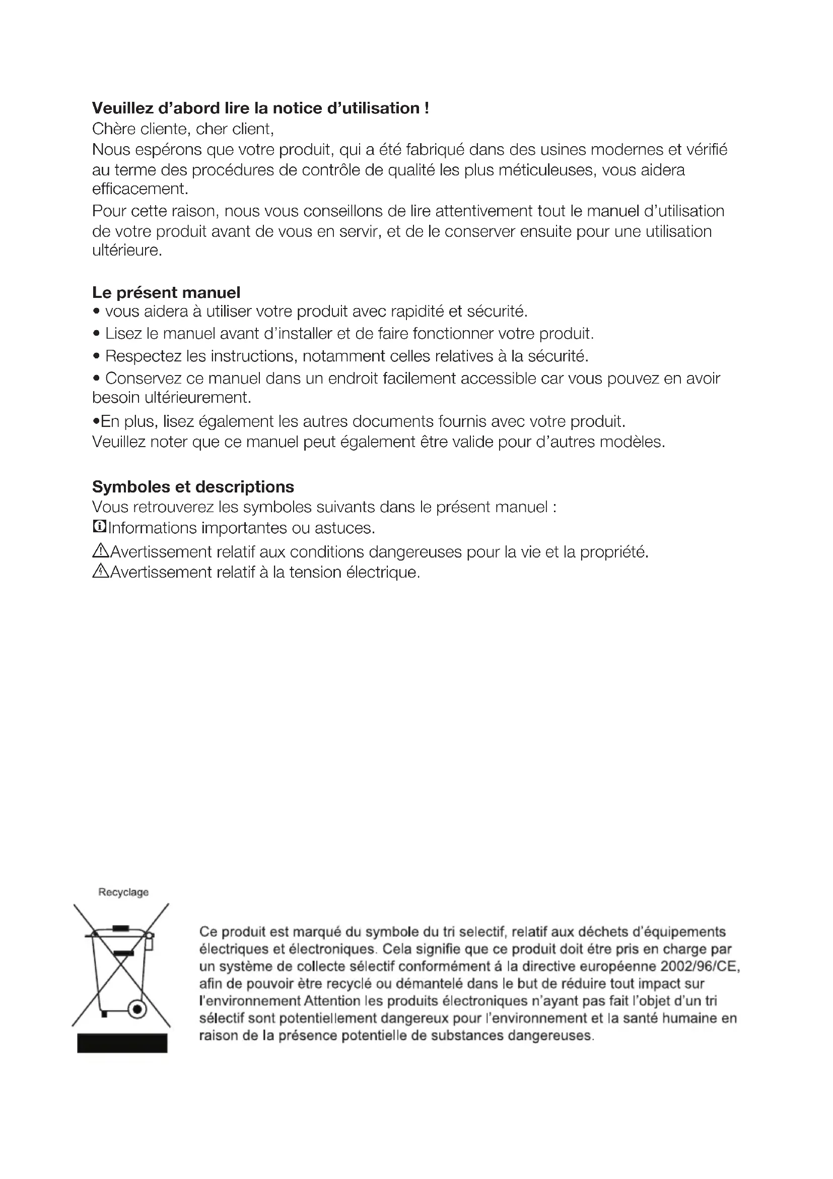 - Lisez le manuel avant d’installer et de faire fonctionner votre produit.