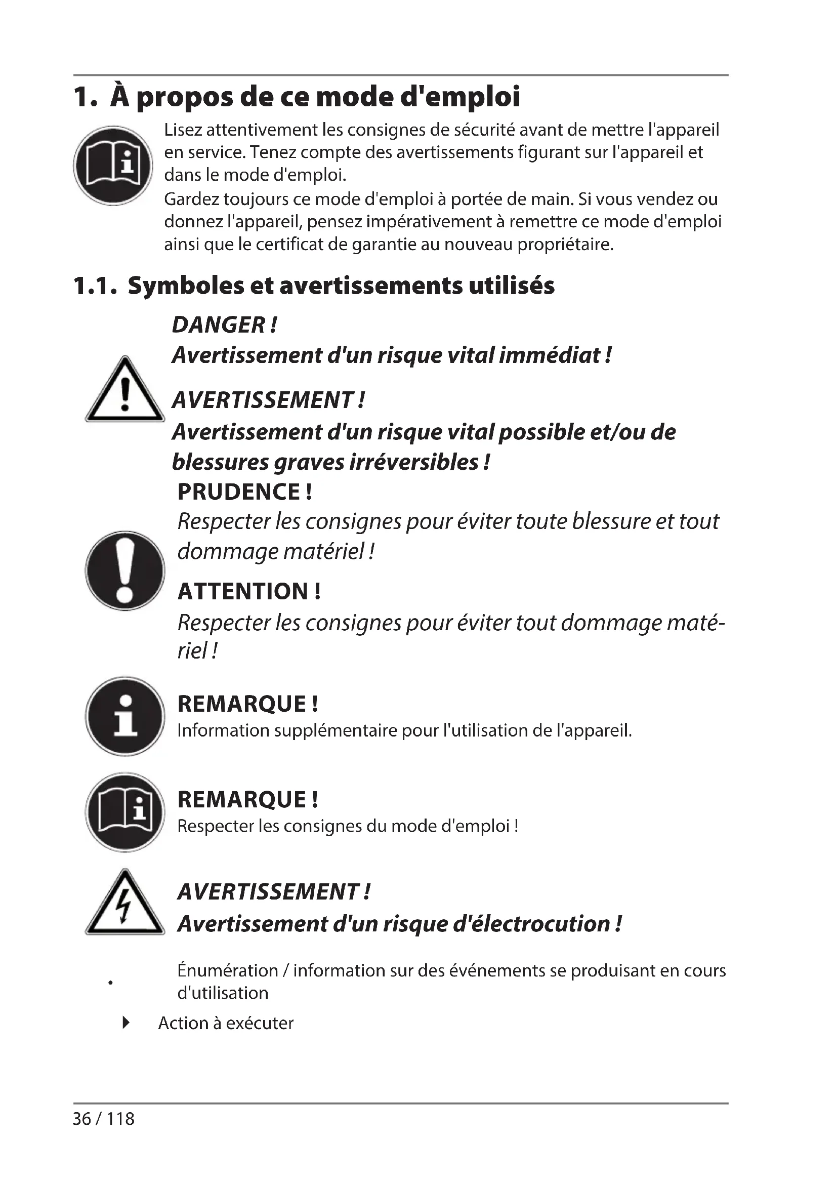 Lisez attentivement les consignes de sécurité avant de mettre l'appareil en service. Tenez compte des avertissements figurant sur l'appareil et dans le mode d'emploi. Gardez toujours ce mode d'emploi à portée de main. Si vous vendez ou donnez l'appareil, pensez impérativement à remettre ce mode d'emploi ainsi que le certificat de garantie au nouveau propriétaire. 1.1. Symboles et avertissements utilisés DANGER ! Avertissement d'un risque vital immédiat ! AVERTISSEMENT ! Avertissement d'un risque vital possible et/ou de blessures graves irréversibles! PRUDENCE ! Respecter les consignes pour éviter toute blessure et tout dommage matériel ! ATTENTION! Respecter les consignes pour éviter tout dommage maté- riel ! REMARQUE ! Information supplémentaire pour l'utilisation de l'appareil. REMARQUE ! Respecter les consignes du mode d'emploi ! AVERTISSEMENT ! Avertissement d'un risque d'électrocution !