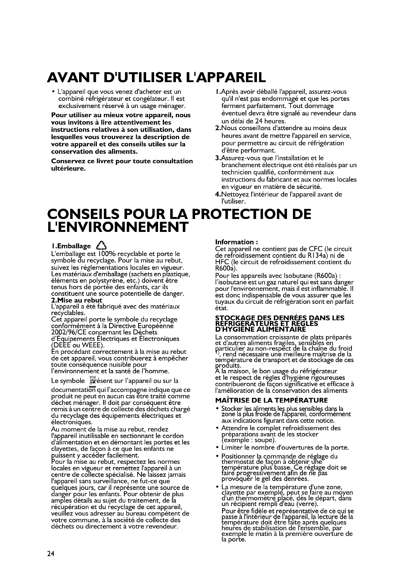 - L'appareil que vous venez d'acheter est un combiné réfrigérateur et congélateur. Il est exclusivement réservé à un usage ménager. Pour utiliser au mieux votre appareil, nous vous invitons à lire attentivement les instructions relatives à son utilisation, dans lesquelles vous trouverez la description de votre appareil et des conseils utiles sur la conservation des aliments. Conservez ce livret pour toute consultation ultérieure. 1.Après avoir déballé l'appareil, assurez-vous qu'il n'est pas endommagé et que les portes ferment parfaitement. Tout dommage éventuel devra être signalé au revendeur dans un délai de 24 heures. 2.Nous conseillons d'attendre au moins deux heures avant de mettre l'appareil en service, pour permettre au circuit de réfrigération d'être performant. 3.Assurez-vous que l'installation et le branchement électrique ont été réalisés par un technicien qualifié, conformément aux instructions du fabricant et aux normes locales en vigueur en matière de sécurité. 4.Nettoyez l'intérieur de l'appareil avant de l'utiliser. 1.Emballage L'emballage est 100% recyclable et porte le symbole du recyclage. Pour la mise au rebut, suivez les réglementations locales en vigueur. Les matériaux d'emballage (sachets en plastique, éléments en polystyrène, etc.) doivent être tenus hors de portée des enfants, car ils constituent une source potentielle de danger. 2.Mise au rebut L'appareil a été fabriqué avec des matériaux recyclables. Cet appareil porte le symbole du recyclage conformément à la Directive Européenne 2002/96/CE concernant les Déchets d’Équipements Électriques et Électroniques (DEEE ou WEEE). En procédant correctement à la mise au rebut de cet appareil, vous contribuerez à empêcher toute conséquence nuisible pour l’environnement et la santé de l’homme. Le symbole présent sur l’appareil ou sur la documentation qui l’accompagne indique que ce produit ne peut en aucun cas être traité comme déchet ménager. Il doit par conséquent être remis à un centre de collecte des déchets chargé du recyclage des équipements électriques et électroniques. Au moment de la mise au rebut, rendez l'appareil inutilisable en sectionnant le cordon d'alimentation et en démontant les portes et les clayettes, de façon à ce que les enfants ne puissent y accéder facilement. Pour la mise au rebut, respectez les normes locales en vigueur et remettez l'appareil à un centre de collecte spécialisé. Ne laissez jamais l'appareil sans surveillance, ne fut-ce que quelques jours, car il représente une source de danger pour les enfants. Pour obtenir de plus amples détails au sujet du traitement, de la récupération et du recyclage de cet appareil, veuillez vous adresser au bureau compétent de votre commune, à la société de collecte des déchets ou directement à votre revendeur. Information : Cet appareil ne contient pas de CFC (le circuit de refroidissement contient du R134a) ni de HFC (le circuit de refroidissement contient du R600a). Pour les appareils avec Isobutane (R600a) : l’isobutane est un gaz naturel qui est sans danger pour l'environnement, mais il est inflammable. Il est donc indispensable de vous assurer que les tuyaux du circuit de réfrigération sont en parfait état.