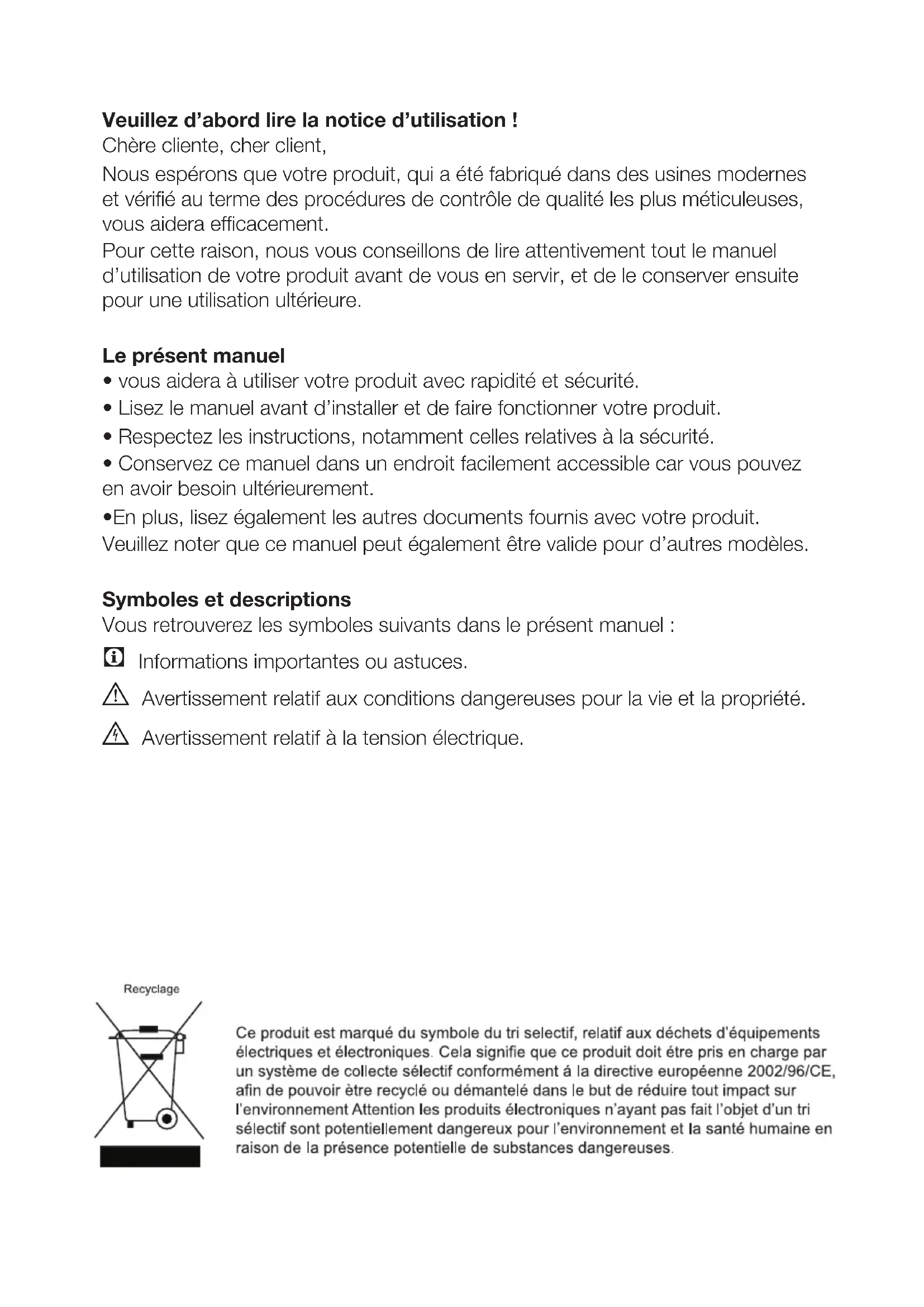 - Возможно, продукты касаются верхней части контейнера. Переместите продукты в контейнере.Veuillez d’abord lire la notice d’utilisation ! Chère cliente, cher client, Nous espérons que votre produit, qui a été fabriqué dans des usines modernes et vérifié au terme des procédures de contrôle de qualité les plus méticuleuses, vous aidera efficacement. Pour cette raison, nous vous conseillons de lire attentivement tout le manuel d’utilisation de votre produit avant de vous en servir, et de le conserver ensuite pour une utilisation ultérieure. Le présent manuel