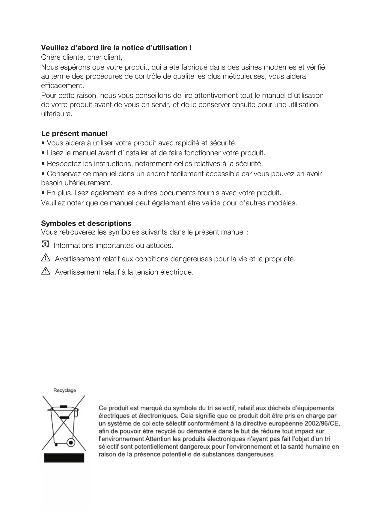 Pour cette raison, nous vous conseillons de lire attentivement tout le manuel d'utilisation de votre produit avant de vous en servir, et de le conserver ensuite pour une utilisation ultérieure.