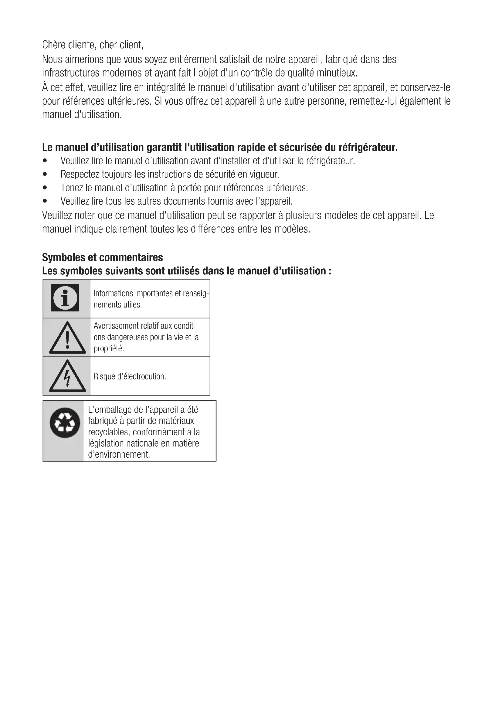 Risque d’électrocution. L’emballage de l’appareil a été fabriqué à partir de matériaux recyclables, conformément à la législation nationale en matière d’environnement.2 / 32 FR Réfrigérateur / Manuel d’utilisation 1 Instructions en matière de sécurité et d’environnement 3 1.1. Sécurité générale . . . . . . . . . . . . . . . . . . . . 3