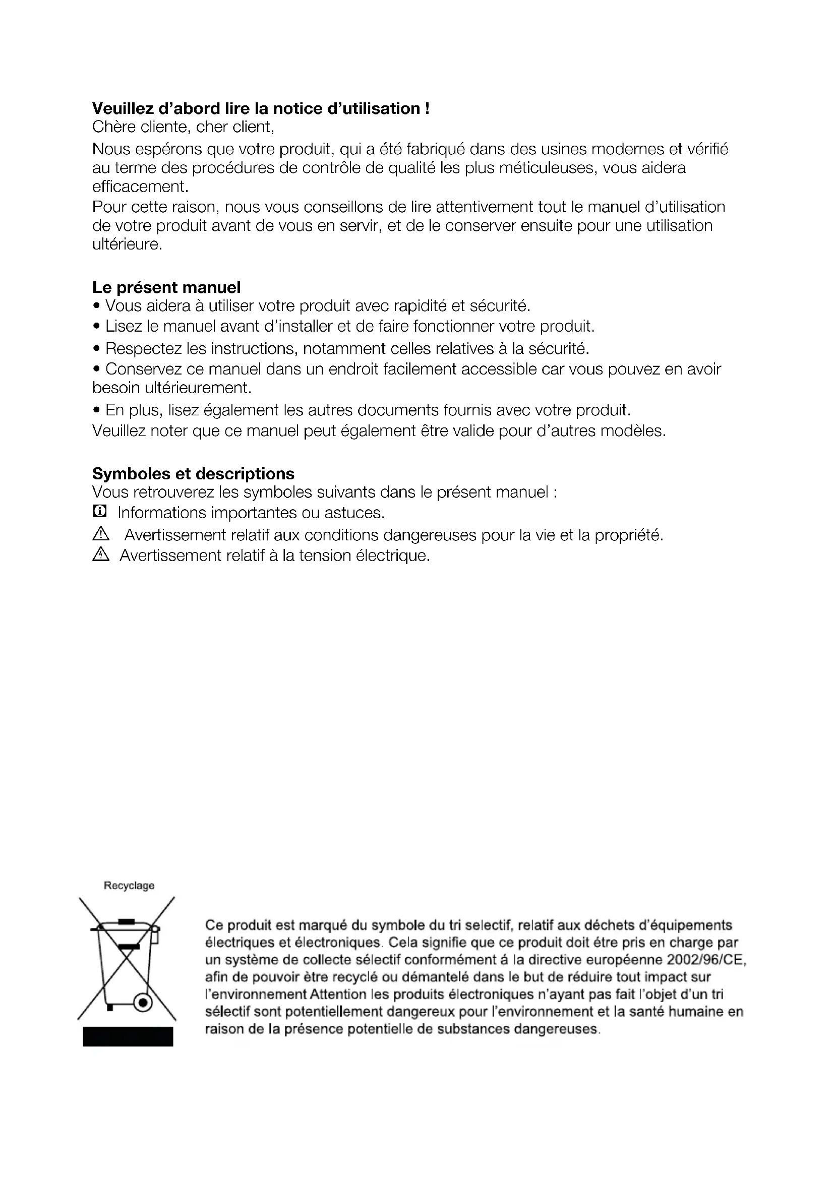 - Lisez le manuel avant d’installer et de faire fonctionner votre produit.