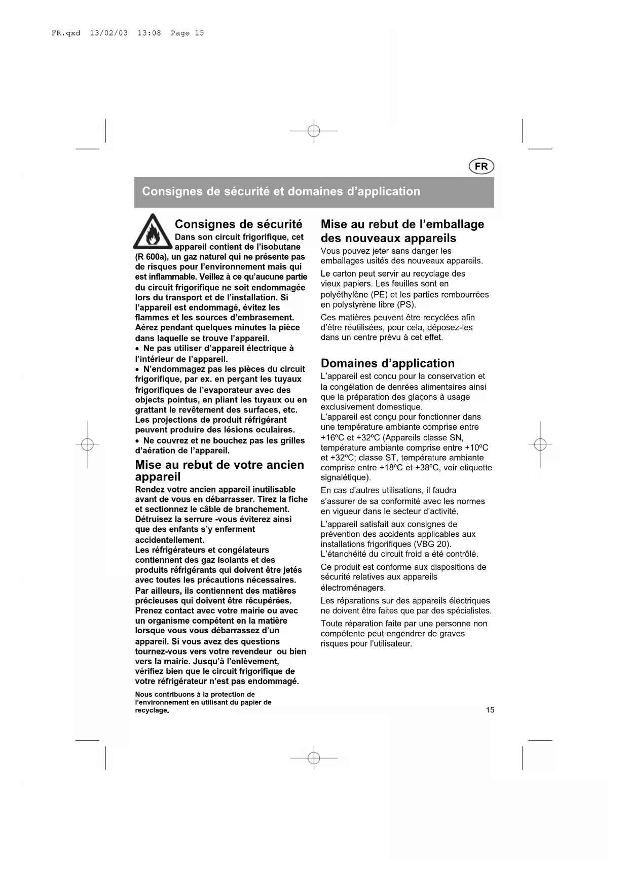 EN.qxd 13/02/03 13:07 Page 13FR.qxd 13/02/03 13:08 Page 14Consignes de sécurité et domaines d’application Consignes de sécurité Dans son circuit frigorifique, cet appareil contient de l’isobutane (R 600a), un gaz naturel qui ne présente pas de risques pour l’environnement mais qui est inflammable. Veillez à ce qu’aucune partie du circuit frigorifique ne soit endommagée lors du transport et de l’installation. Si l’appareil est endommagé, évitez les flammes et les sources d’embrasement. Aérez pendant quelques minutes la pièce dans laquelle se trouve l’appareil.