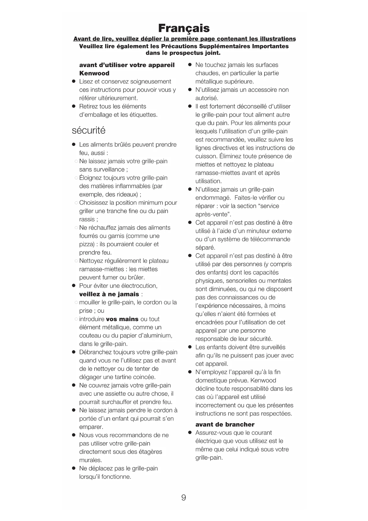 N’employez l’appareil qu’à la fin domestique prévue. Kenwood décline toute responsabilité dans les cas où l’appareil est utilisé incorrectement ou que les présentes instructions ne sont pas respectées. avant de brancher