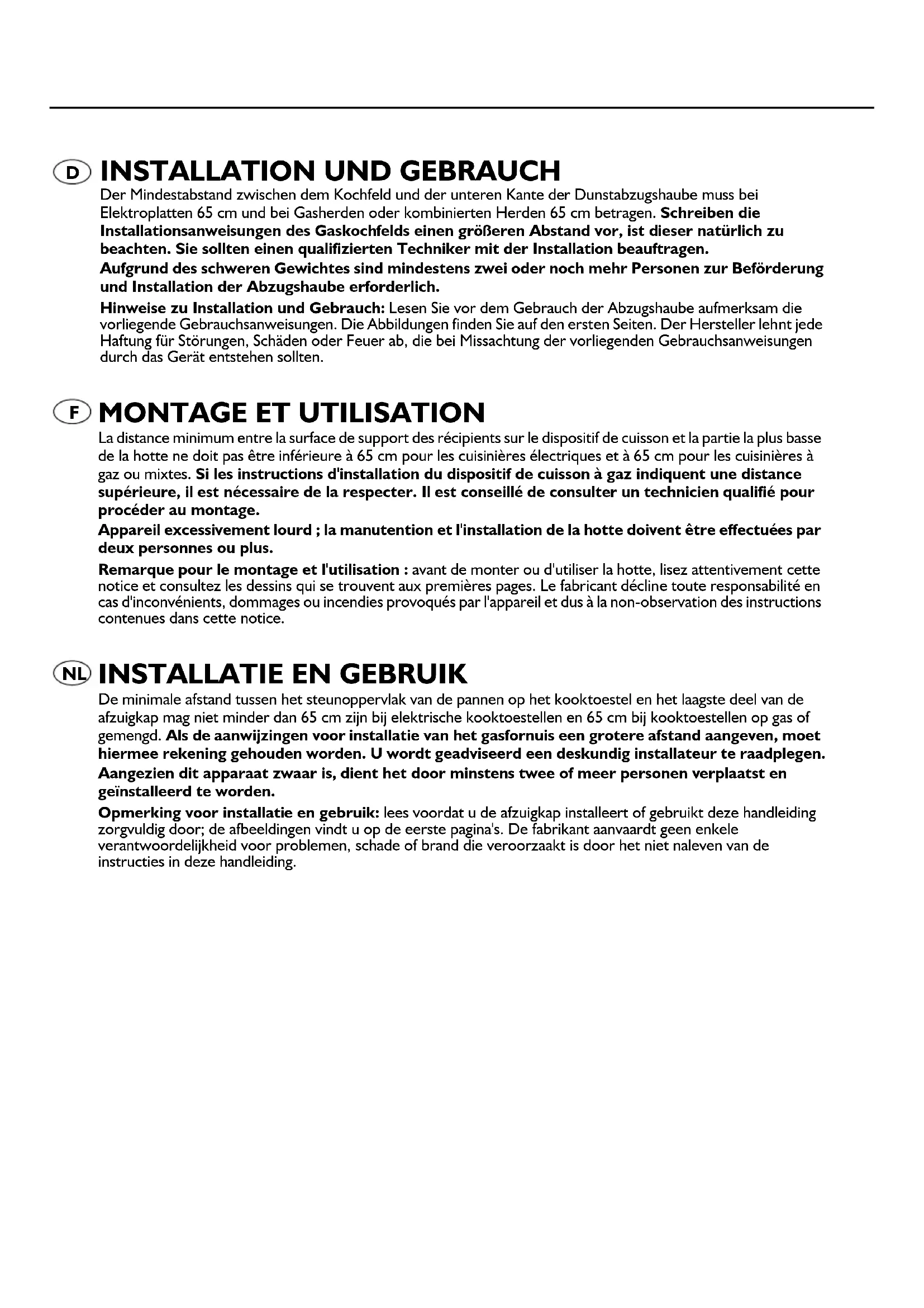 La distance minimum entre la surface de support des récipients sur le dispositif de cuisson et la partie la plus basse de la hotte ne doit pas être inférieure à 65 cm pour les cuisinières électriques et à 65 cm pour les cuisinières à gaz ou mixtes. Si les instructions d'installation du dispositif de cuisson à gaz indiquent une distance supérieure, il est nécessaire de la respecter. Il est conseillé de consulter un technicien qualifié pour procéder au montage. Appareil excessivement lourd ; la manutention et l'installation de la hotte doivent être effectuées par deux personnes ou plus. Remarque pour le montage et l'utilisation : avant de monter ou d'utiliser la hotte, lisez attentivement cette notice et consultez les dessins qui se trouvent aux premières pages. Le fabricant décline toute responsabilité en cas d'inconvénients, dommages ou incendies provoqués par l'appareil et dus à la non-observation des instructions contenues dans cette notice.
