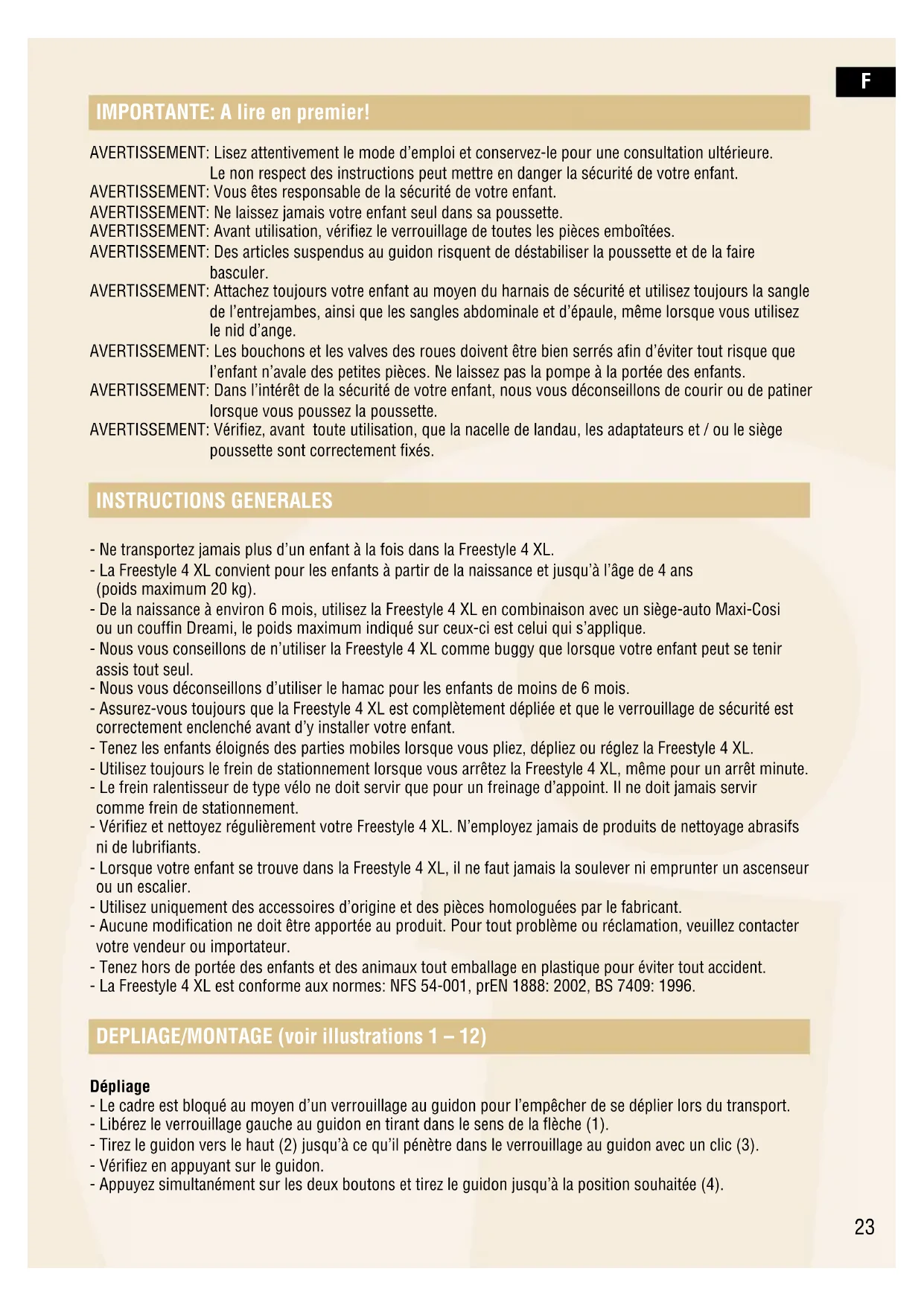poussette sont correctement fixés. INSTRUCTIONS GENERALES - Ne transportez jamais plus d’un enfant à la fois dans la Freestyle 4 XL. - La Freestyle 4 XL convient pour les enfants à partir de la naissance et jusqu’à l’âge de 4 ans (poids maximum 20 kg). - De la naissance à environ 6 mois, utilisez la Freestyle 4 XL en combinaison avec un siège-auto Maxi-Cosi ou un couffin Dreami, le poids maximum indiqué sur ceux-ci est celui qui s’applique. - Nous vous conseillons de n’utiliser la Freestyle 4 XL comme buggy que lorsque votre enfant peut se tenir assis tout seul. - Nous vous déconseillons d’utiliser le hamac pour les enfants de moins de 6 mois. - Assurez-vous toujours que la Freestyle 4 XL est complètement dépliée et que le verrouillage de sécurité est correctement enclenché avant d’y installer votre enfant. - Tenez les enfants éloignés des parties mobiles lorsque vous pliez, dépliez ou réglez la Freestyle 4 XL. - Utilisez toujours le frein de stationnement lorsque vous arrêtez la Freestyle 4 XL, même pour un arrêt minute. - Le frein ralentisseur de type vélo ne doit servir que pour un freinage d’appoint. Il ne doit jamais servir comme frein de stationnement. - Vérifiez et nettoyez régulièrement votre Freestyle 4 XL. N’employez jamais de produits de nettoyage abrasifs ni de lubrifiants. - Lorsque votre enfant se trouve dans la Freestyle 4 XL, il ne faut jamais la soulever ni emprunter un ascenseur ou un escalier. - Utilisez uniquement des accessoires d’origine et des pièces homologuées par le fabricant. - Aucune modification ne doit être apportée au produit. Pour tout problème ou réclamation, veuillez contacter votre vendeur ou importateur. - Tenez hors de portée des enfants et des animaux tout emballage en plastique pour éviter tout accident. - La Freestyle 4 XL est conforme aux normes: NFS 54-001, prEN 1888: 2002, BS 7409: 1996. DEPLIAGE/MONTAGE (voir illustrations 1 – 12) Dépliage - Le cadre est bloqué au moyen d’un verrouillage au guidon pour l’empêcher de se déplier lors du transport. - Libérez le verrouillage gauche au guidon en tirant dans le sens de la flèche (1). - Tirez le guidon vers le haut (2) jusqu’à ce qu’il pénètre dans le verrouillage au guidon avec un clic (3). - Vérifiez en appuyant sur le guidon. - Appuyez simultanément sur les deux boutons et tirez le guidon jusqu’à la position souhaitée (4).F Montage des roues - Les 2 roues avec cylindre de freins doivent être montées à l’arrière. - Appuyez sur le bouton au centre du cache-moyeu (5/8) tout en enfonçant l’essieu dans son logement (7). - Vérifiez que chaque roue est bien fixée. - Vérifiez la pression des pneus et gonflez-les si nécessaire (vous trouverez la pression maximum des pneus dans la section entretien). Démontage des roues - Pour démonter les roues arrière, appuyez sur le bouton au centre du cache-moyeu (5/8) et retirez la roue de son logement (9). Réglage en hauteur du guidon - Pour régler la hauteur du guidon, appuyez simultanément sur les boutons de chaque côté (4.1) et manoeuvrez le guidon jusqu’à la position souhaitée (4.2). Pliage - Repliez la capote (voir “Montage/démontage de la capote”). - Placez le dossier du hamac en position inclinée (voir “Réglage du dossier”). - Placez le repose-pieds en position haute (voir “Repose-pieds”). - Repoussez le bloque-châssis sur la manette de verrouillage du montant droit du guidon (10). - Tirez vers le haut les manettes de verrouillages gauche et droite des montants du guidon et poussez le guidon vers l’avant pour replier la Freestyle 4 XL (11). - Assurez-vous que la manette de verrouillage s’enclenche bien dans le bloque-châssis permettant de faciliter le transport (vous devrez entendre un clic) (12). - Pour un encombrement minimum, retirez les roues et le hamac (voir “Fixation du hamac”). FREIN DE STATIONNEMENT (voir illustration 13) - Utilisez toujours ce frein pour arrêter la Freestyle 4 XL, même pour un arrêt minute. - Bloquez les roues en appuyant avec le pied sur l’essieu arrière (13). - Libérez le frein de stationnement en tirant la pédale vers le haut. - Le frein à main ne sert que comme ralentisseur et ne doit pas être utilisé comme frein de stationnement. Le frein à main fonctionne sur les deux roues arrière. Si vous le serrez trop fort ou trop vite, vous risquez de culbuter sur la Freestyle 4 XL et de blesser votre enfant. - Vérifiez toujours que les roues sont bloquées. UTILISATION Utilisation avec la nacelle Dreami (jusqu’à 9 kg) et le siège-auto Maxi-Cosi (jusqu’à 13 kg) (voir illustrations 14 – 20) Fixation des adaptateurs - Retirez d’abord les caches-adaptateurs en déplaçant vers l’extérieur le bouton rouge sous les connecteurs des adaptateurs, et en poussant les caches vers le haut (14). - Faites glisser l’adaptateur A dans le côté droit du logement et l’adaptateur B dans le côté gauche du logement. - Continuez à les faire glisser jusqu’à entendre un clic (15). - Vérifiez que les adaptateurs sont bien en place. Installation de la nacelle Dreami - Dépliez la poussette et placez la nacelle sur les adaptateurs, avec l’extrémité pieds entre les montants du guidon (16). - Vérifiez que la nacelle est bien attaché. 24F