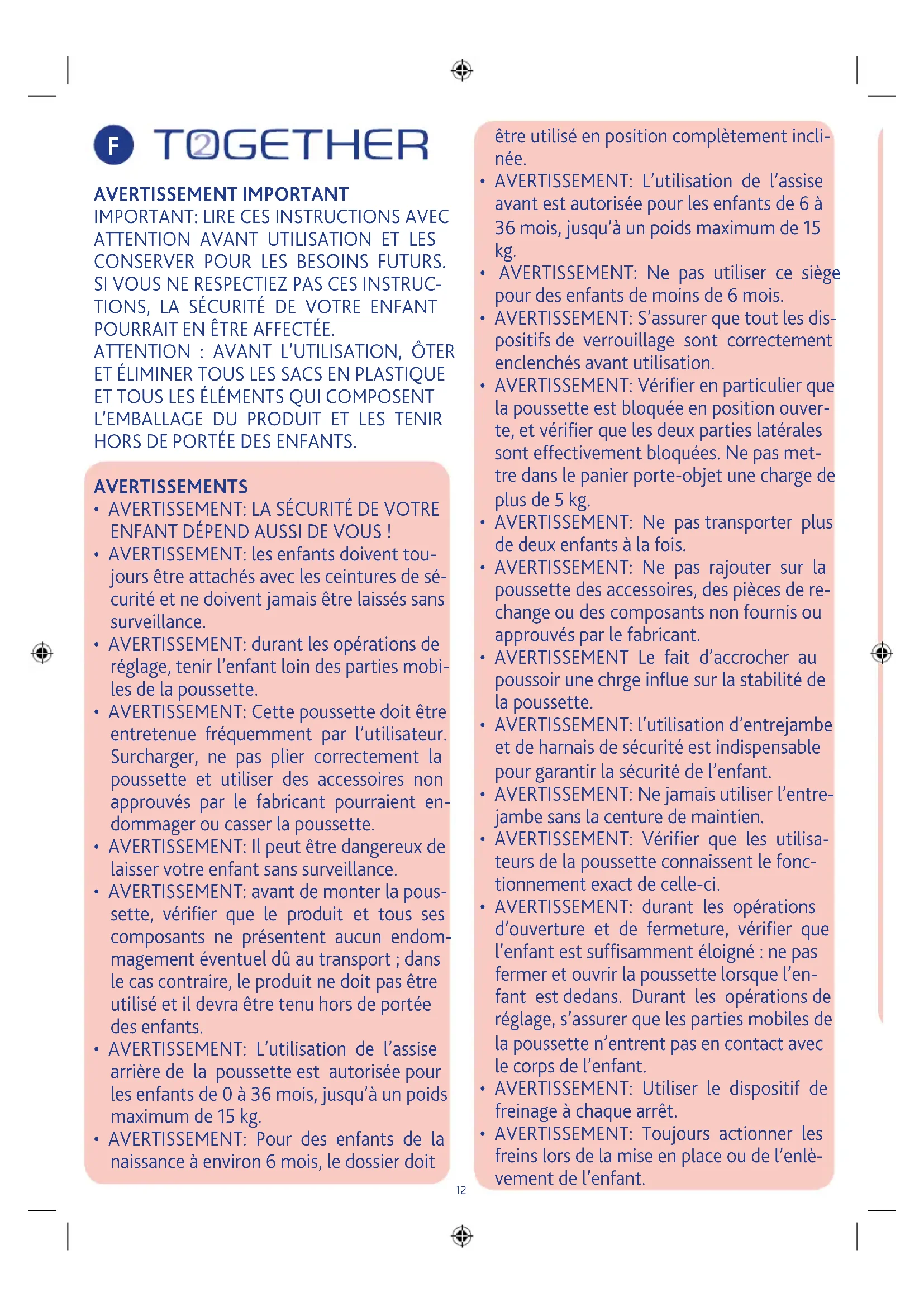 - AVERTISSEMENT: Toujours actionner les freins lors de la mise en place ou de l’enlè- vement de l’enfant. F12